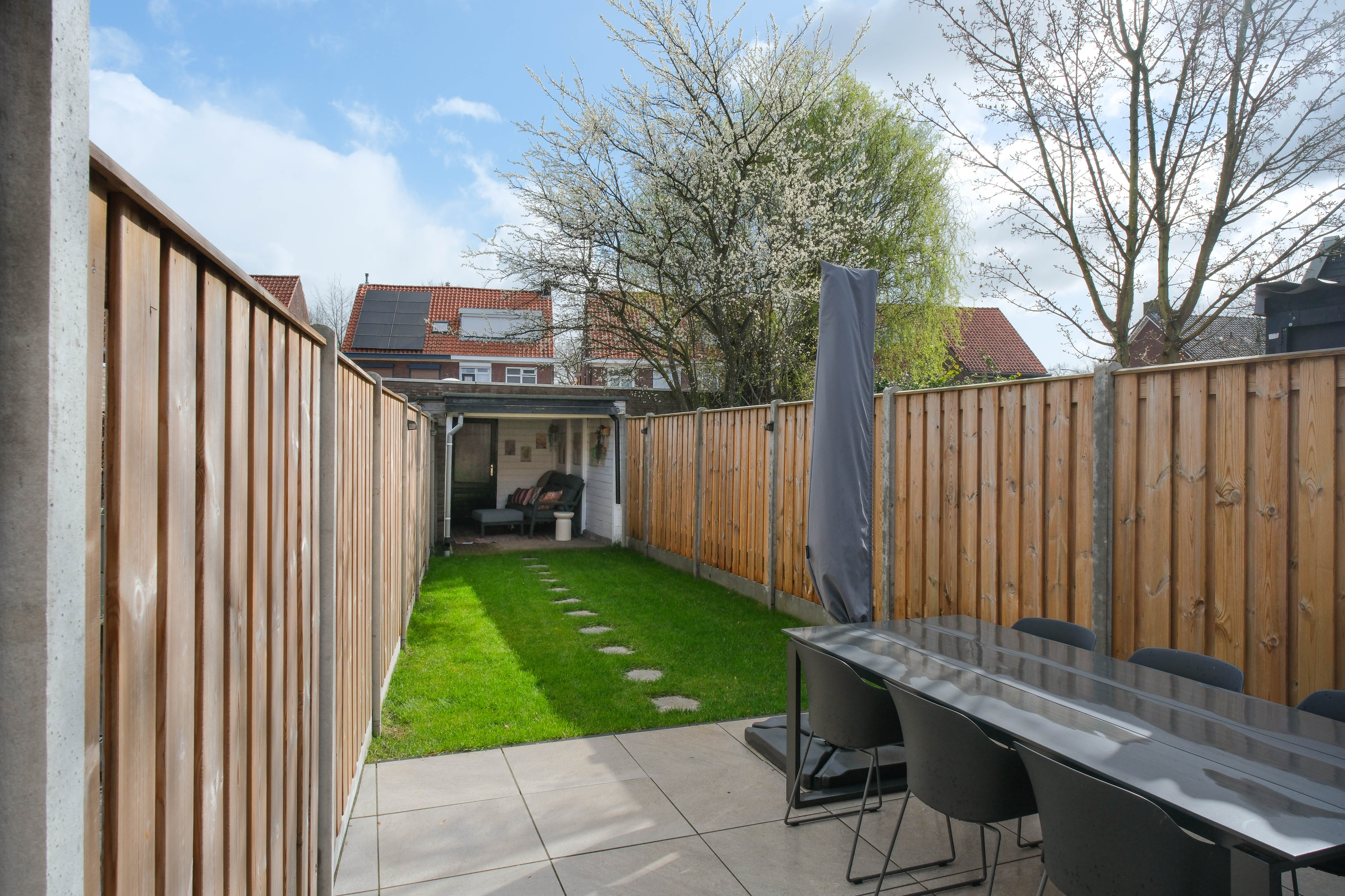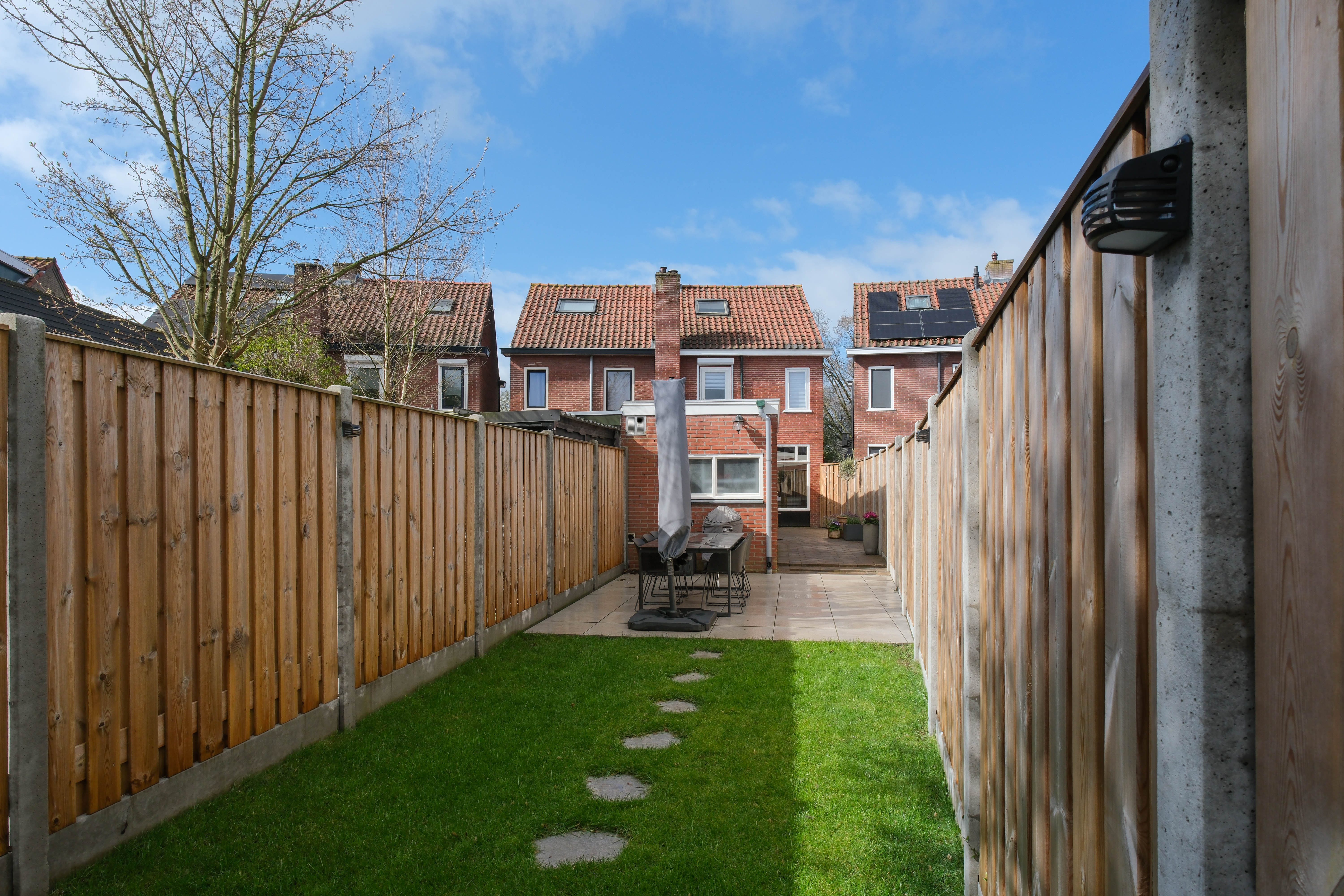 Buiten wordt het verhaal compleet. De achtertuin is in 2024 opnieuw aangelegd. Strak, verzorgd en met meerdere terrassen zodat je altijd een plek in de zon vindt.