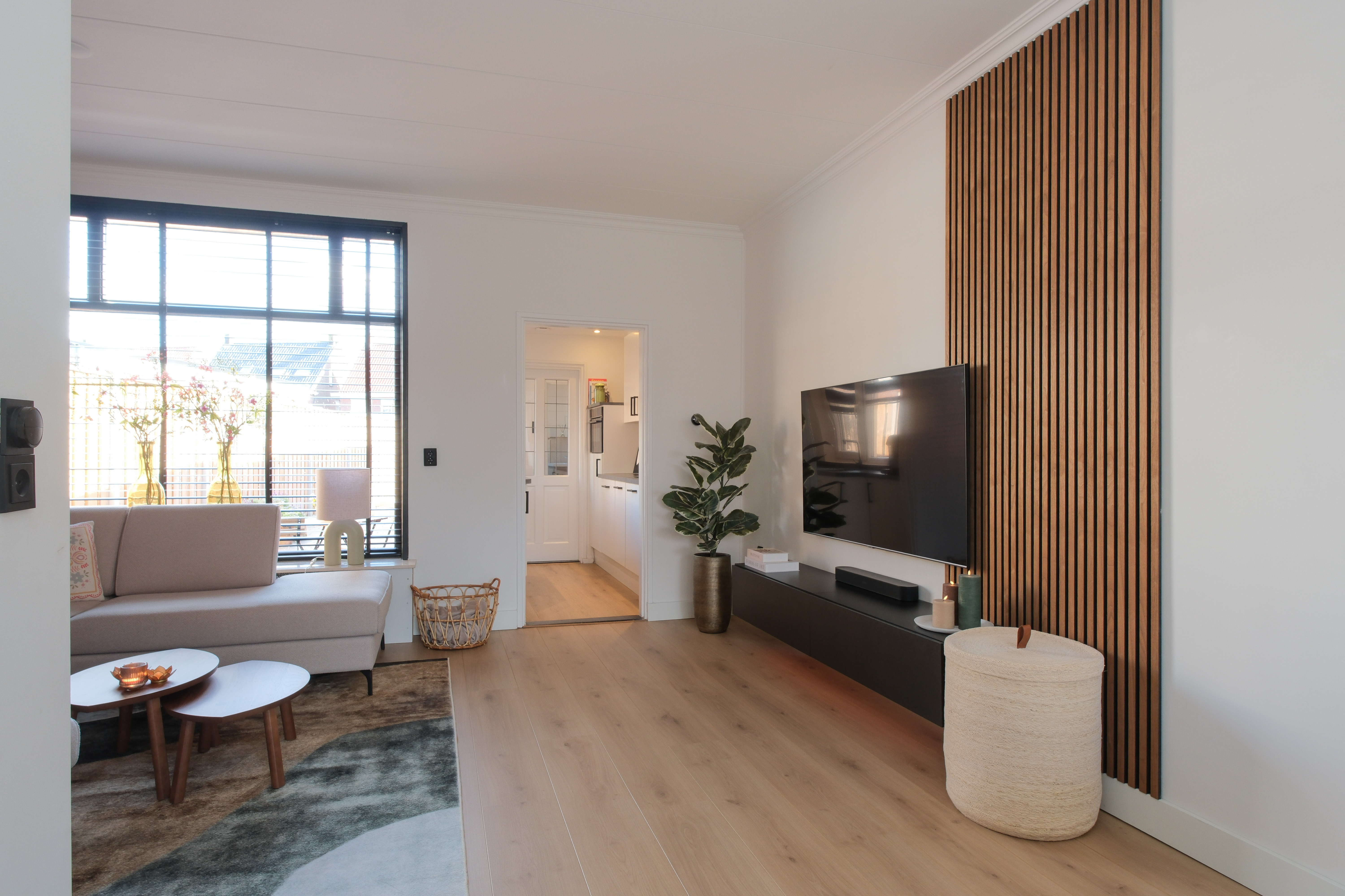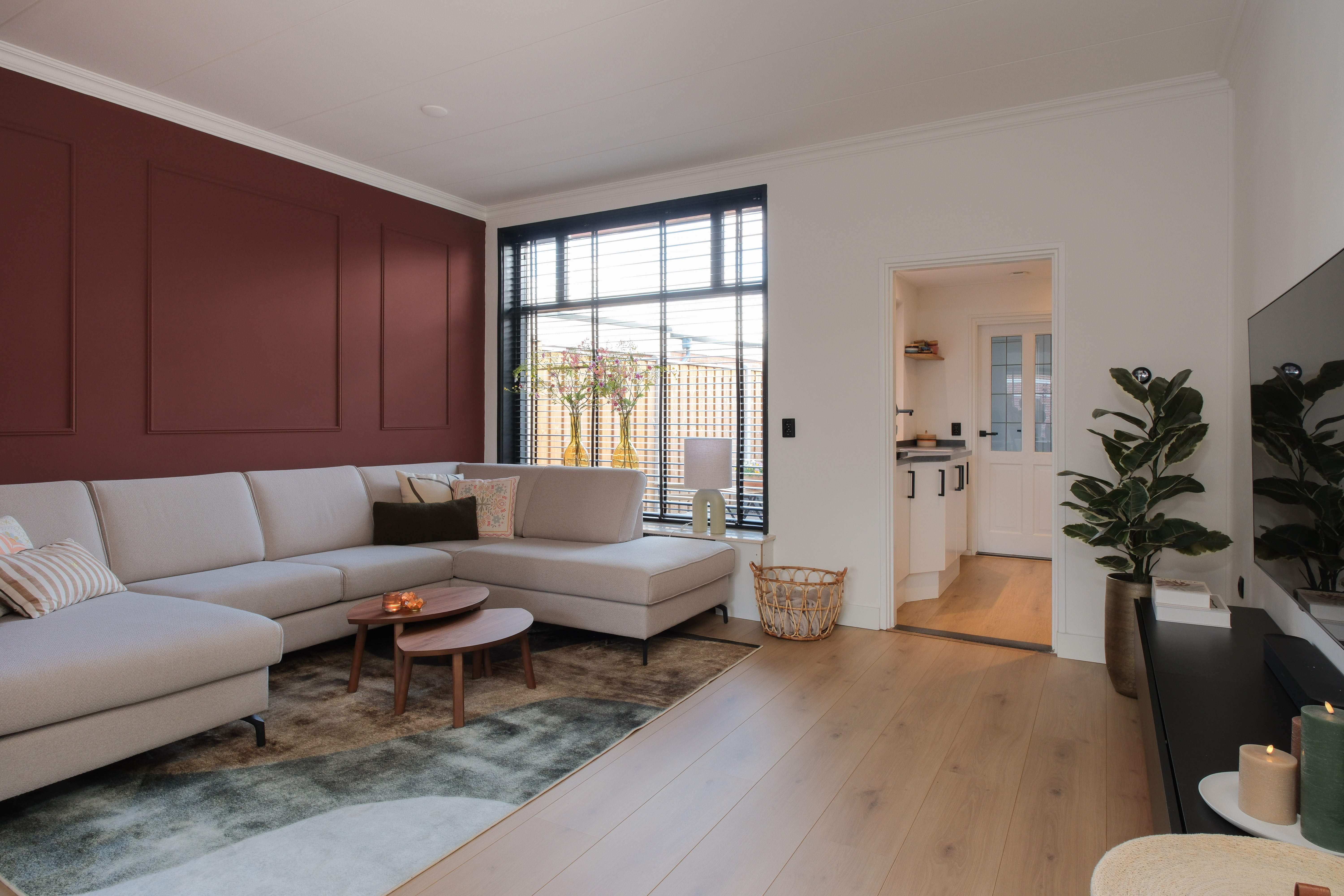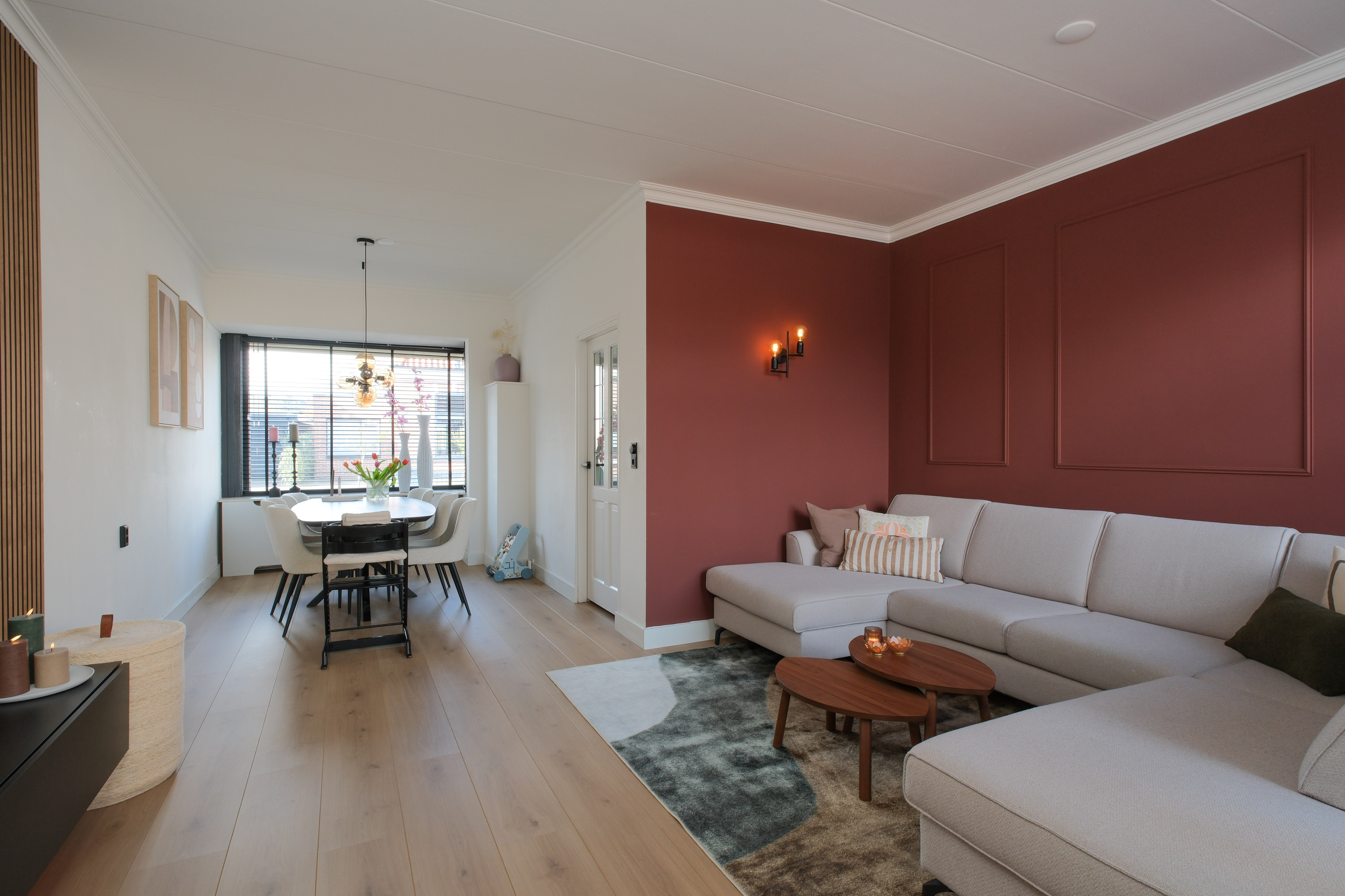 De karakteristieke erker aan de voorzijde geeft de woonkamer niet alleen sfeer, maar ook een prachtige lichtinval. In combinatie met de warme afwerking ontstaat hier een woonkamer die opvalt.