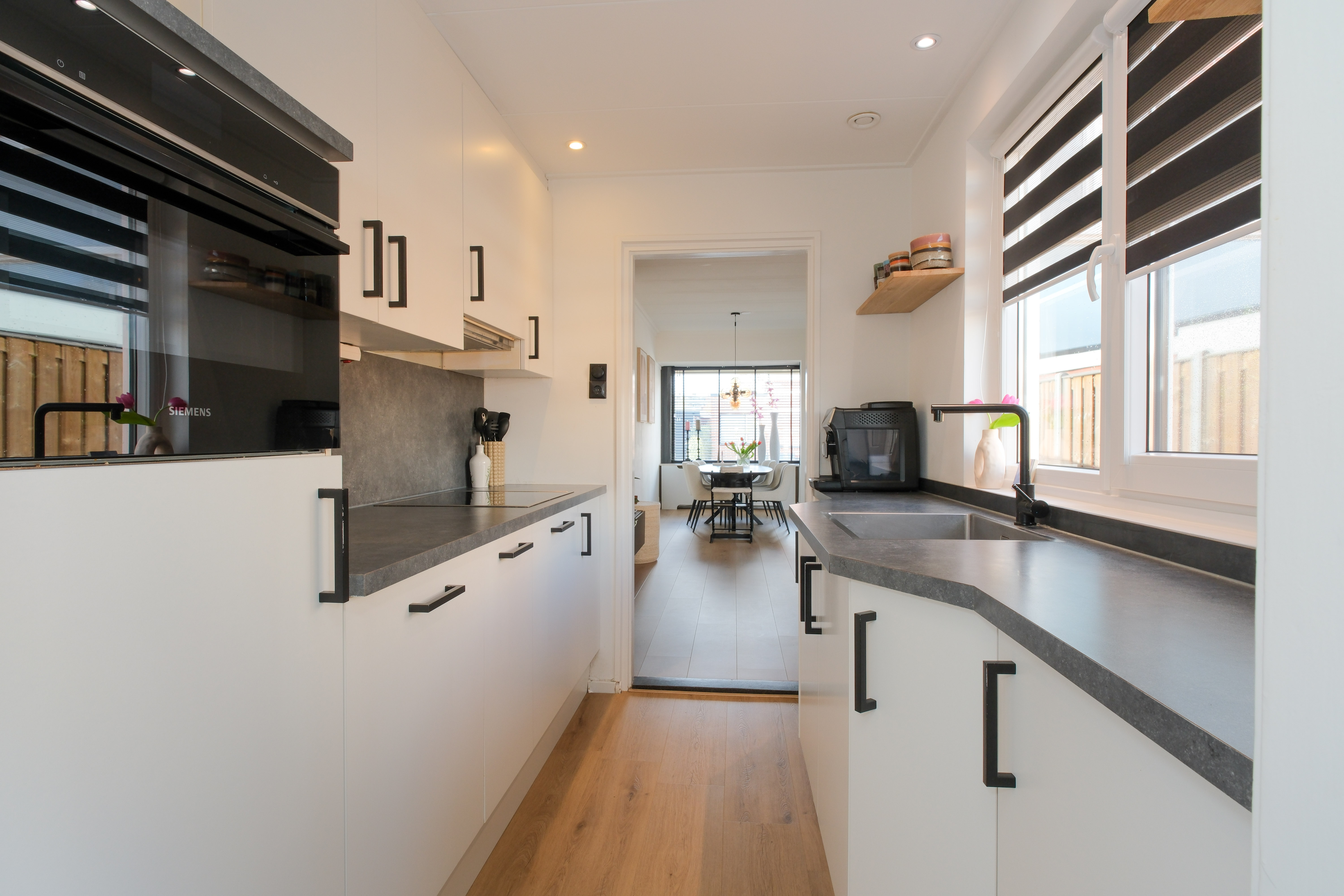 De keuken gesitueerd in de aanbouw is netjes, compleet en ingericht met o.a. een vaatwasser, combi-oven, koelkast, afzuigkap en inductiekookplaat. Via de tussendeur tref je aansluitend het achterportaal/bijkeuken met ruimte voor wasmachine en droger en een separate toiletruimte met hangcloset én de moderne badkamer met ruime inloopdouche en wastafelmeubel.