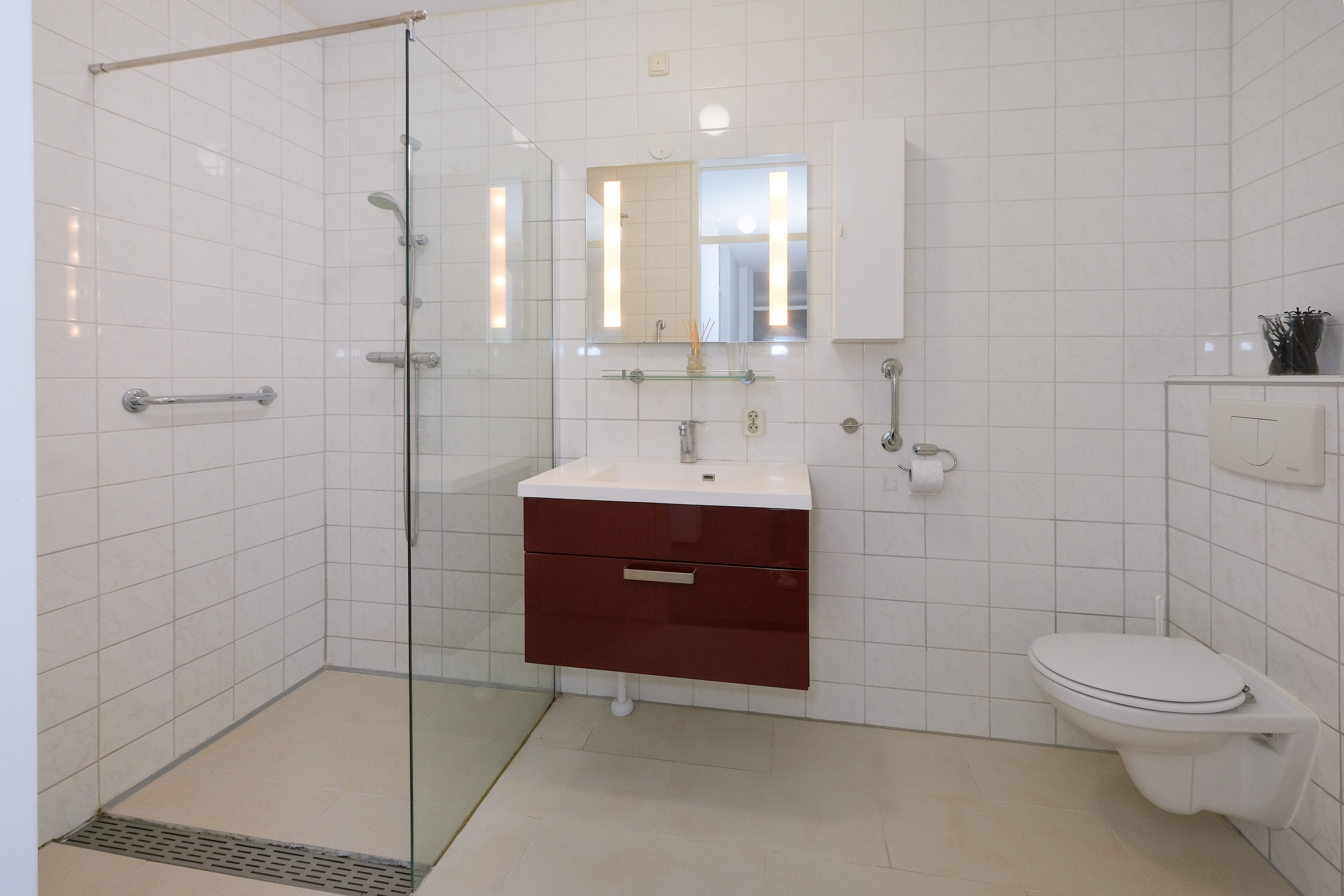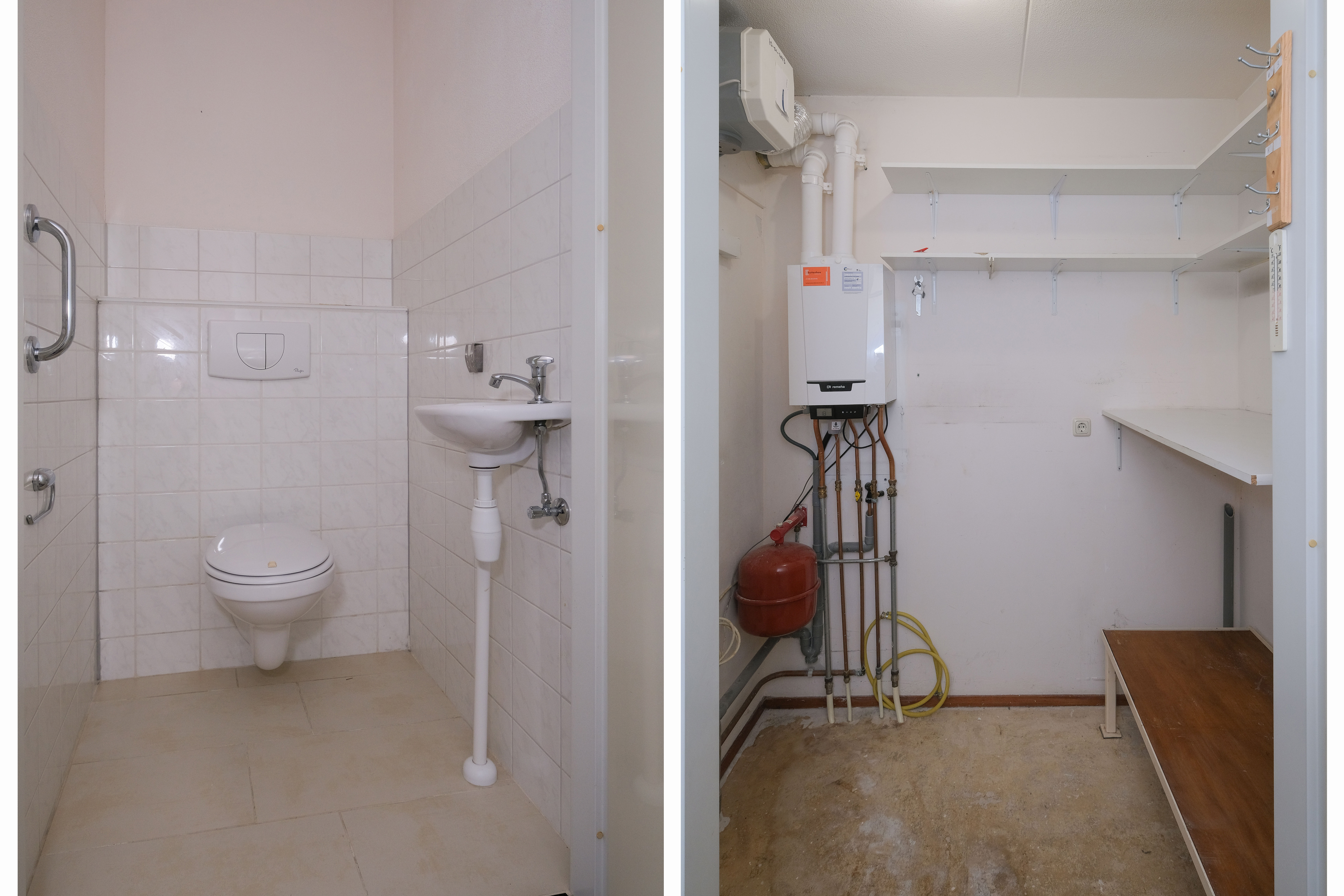 De grote hal brengt je naar twee prettige slaapkamers (± 15,5 m² en ± 12 m²) – de één ruim als hoofdslaapkamer met toegang tot het balkon, de ander ideaal als werkplek, logeerkamer of juist als royale kastenkamer. De bijkeuken biedt plek voor je wasmachine, droger, CV-ketel en extra bergruimte. De badkamer is compleet met een douche, wastafelmeubel en tweede toilet. Daarnaast is er nog een separaat toilet, modern en vrijhangend.