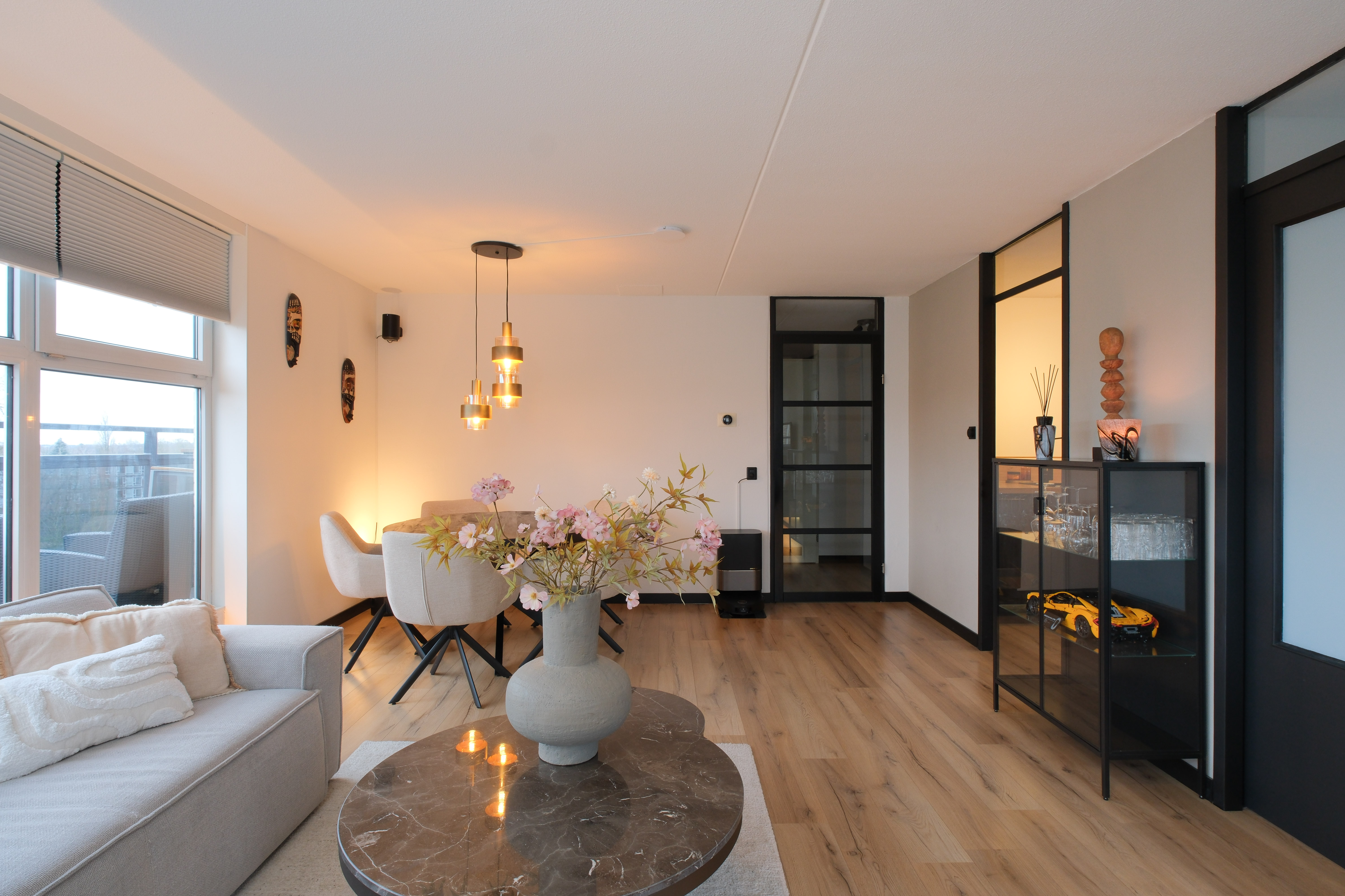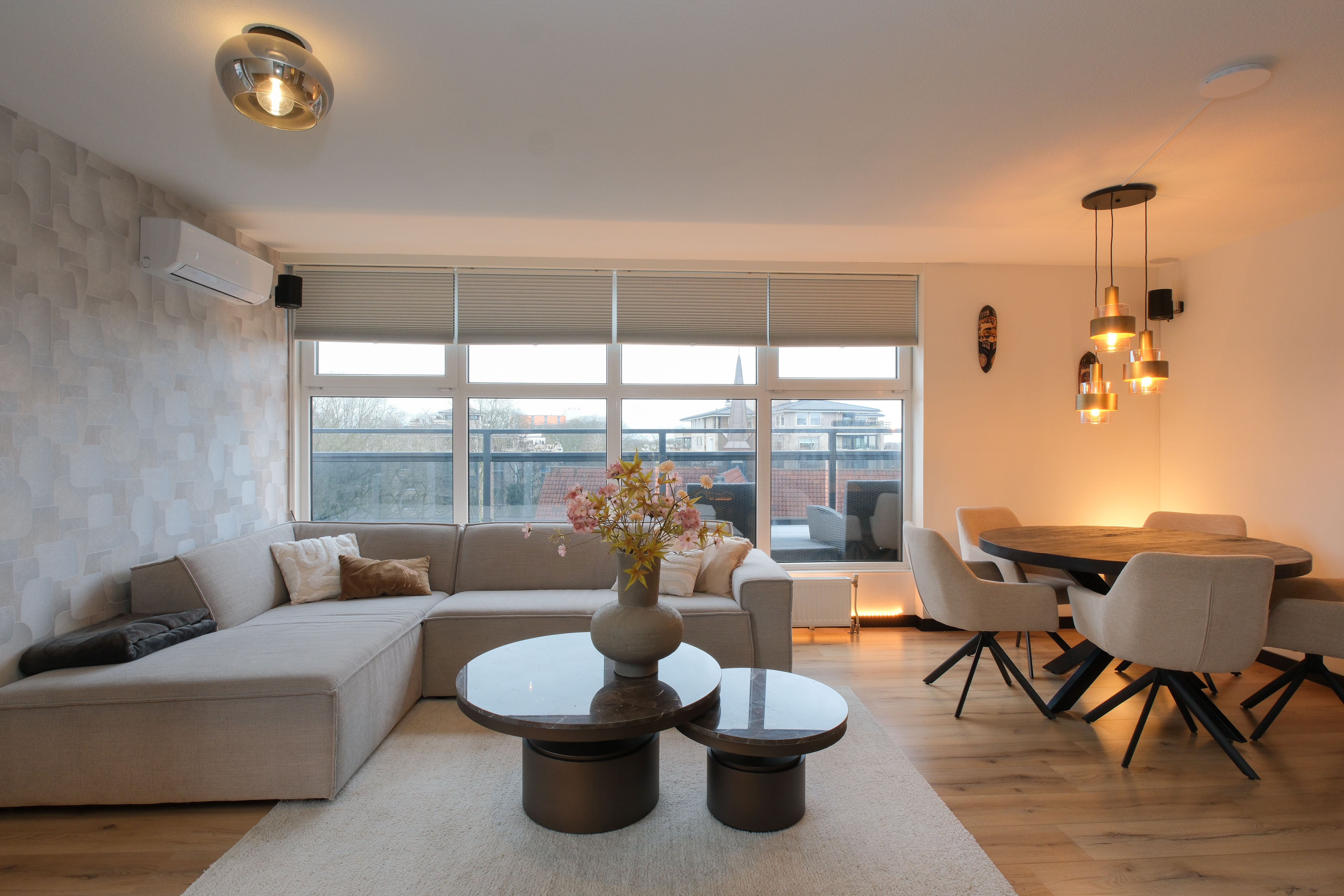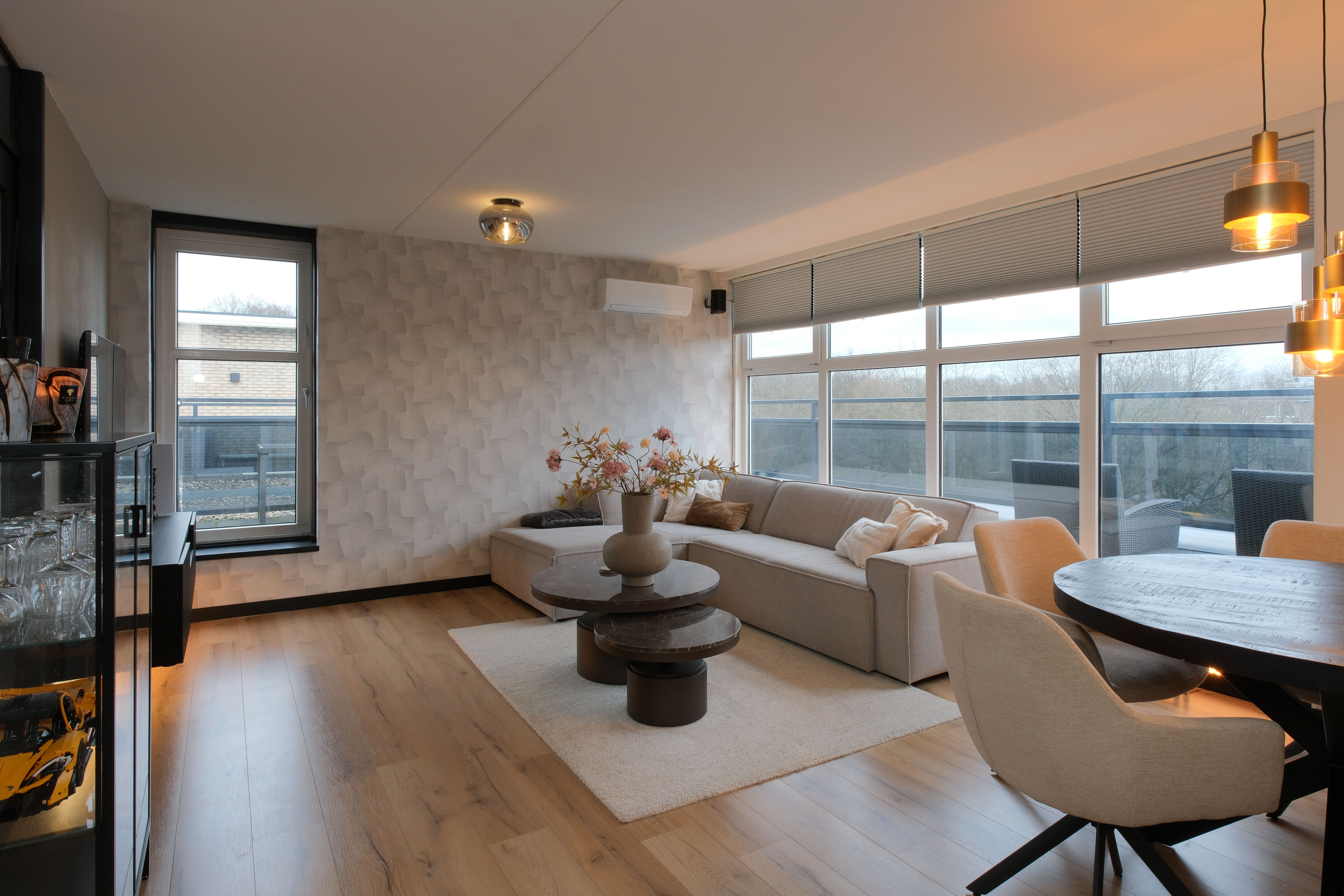 De woonkamer is licht, sfeervol, strak afgewerkt met o.a. moderne vloerafwerking en staat in directe verbinding met het dakterras. Grote raampartijen zorgen voor een open gevoel en laten het uitzicht onderdeel worden van je dagelijkse leven. Hier schuif je op een zomerdag moeiteloos de deur open en verleng je je leefruimte naar buiten.