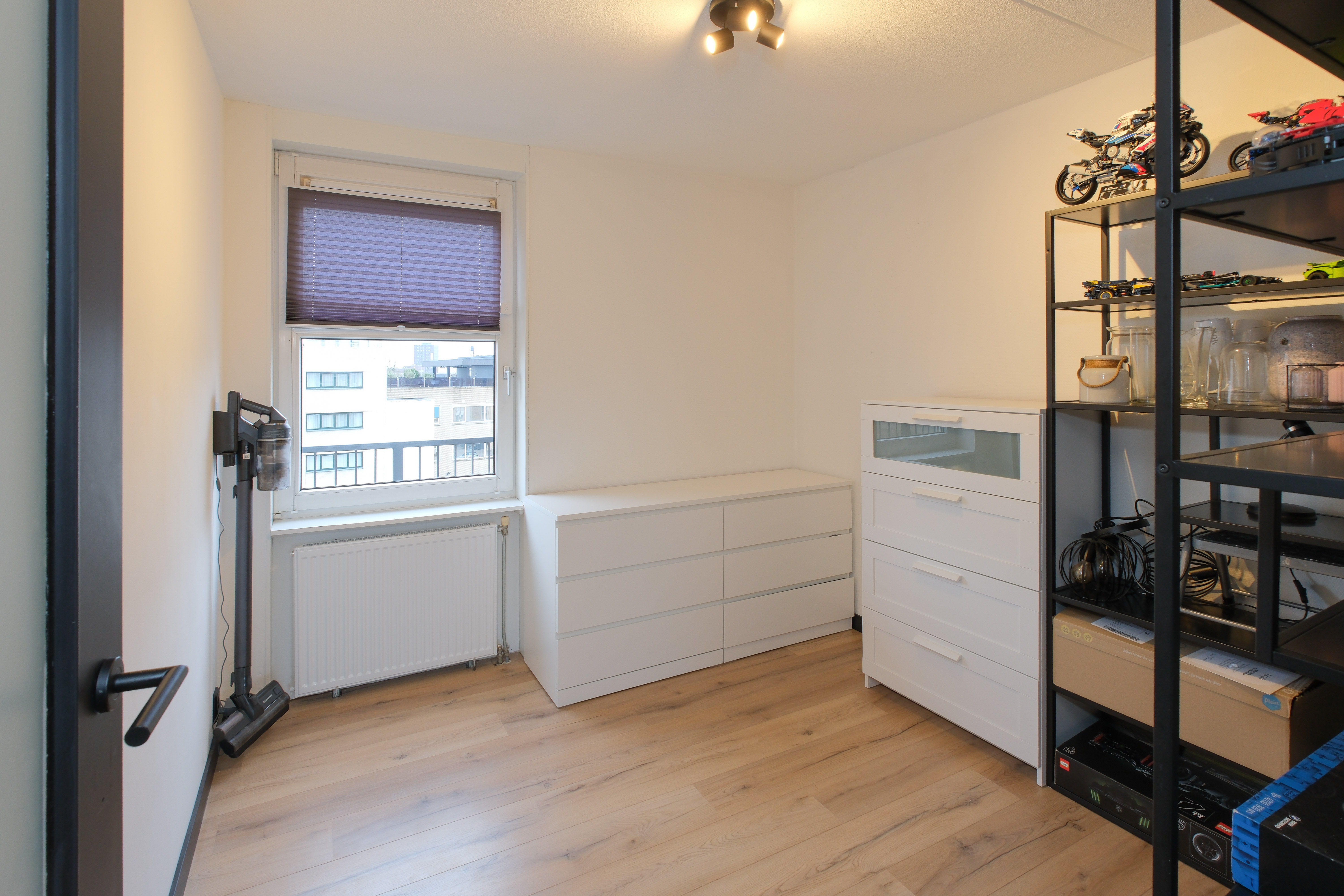 Indeling penthouse: 5e verdieping: De hal voelt ruim en rustig aan en geeft toegang tot alle vertrekken. Het separate toilet is strak en modern uitgevoerd. De badkamer is in 2019 smaakvol vernieuwd en voorzien van een inloopdouche en een wastafelmeubel, tijdloos en verzorgd.