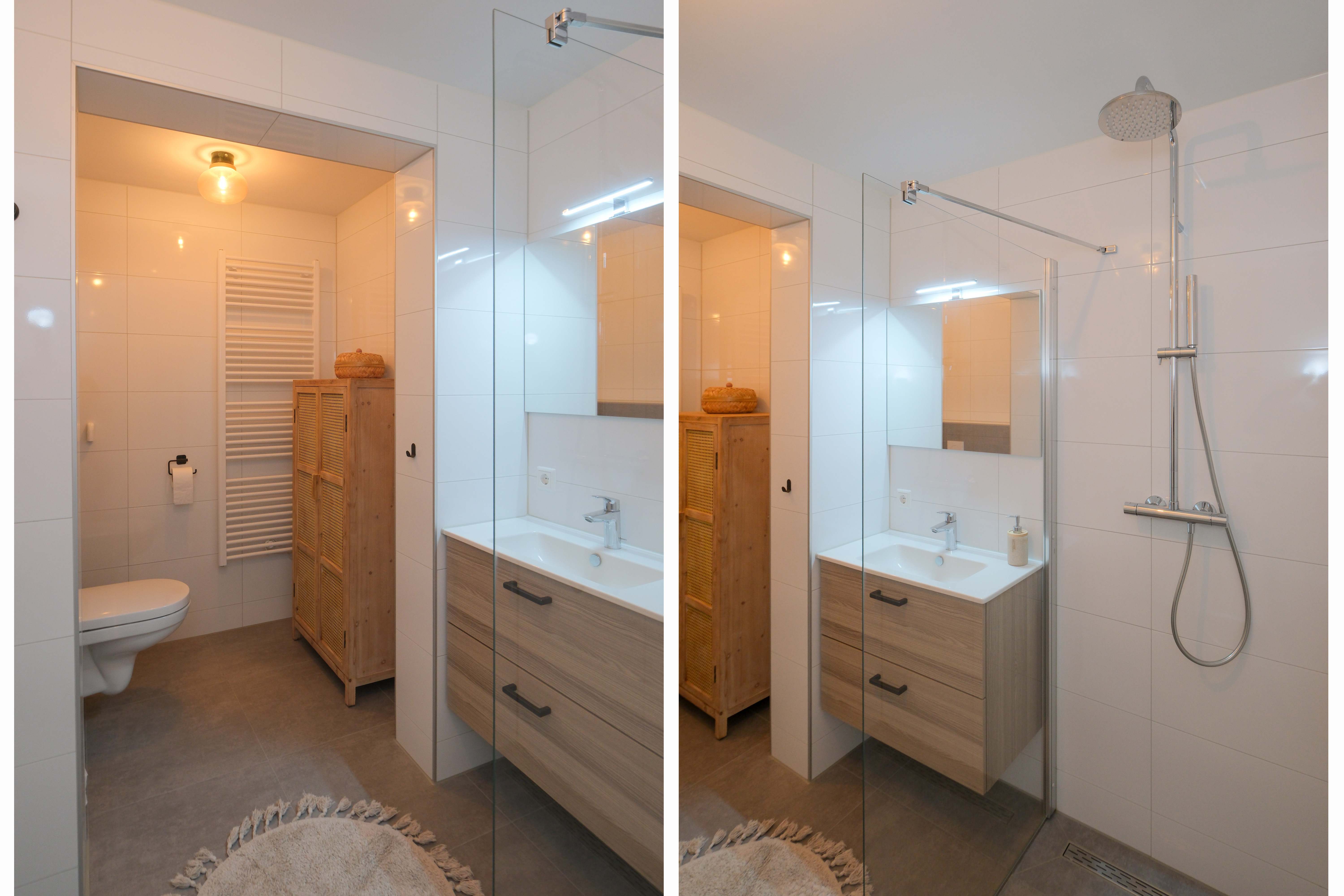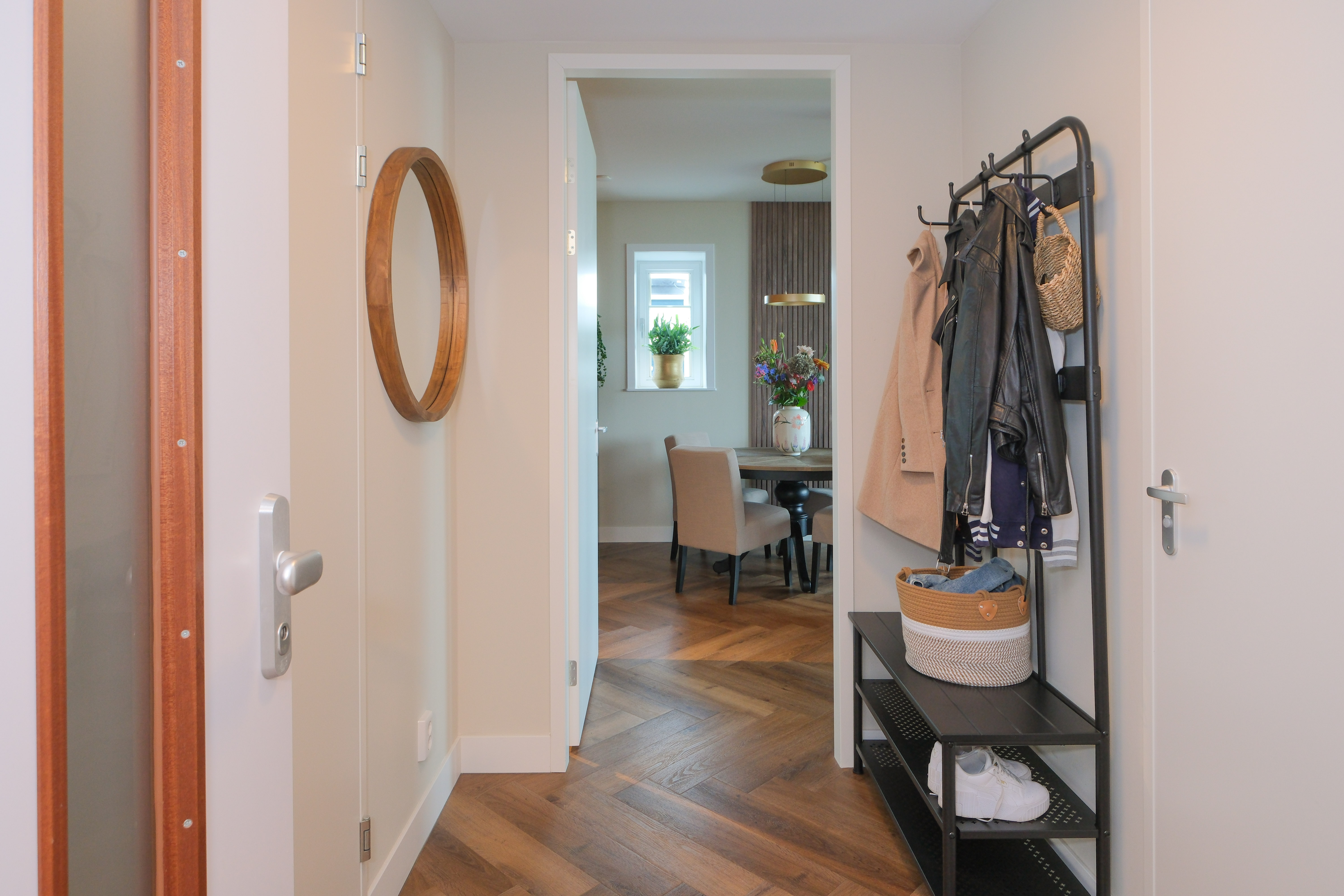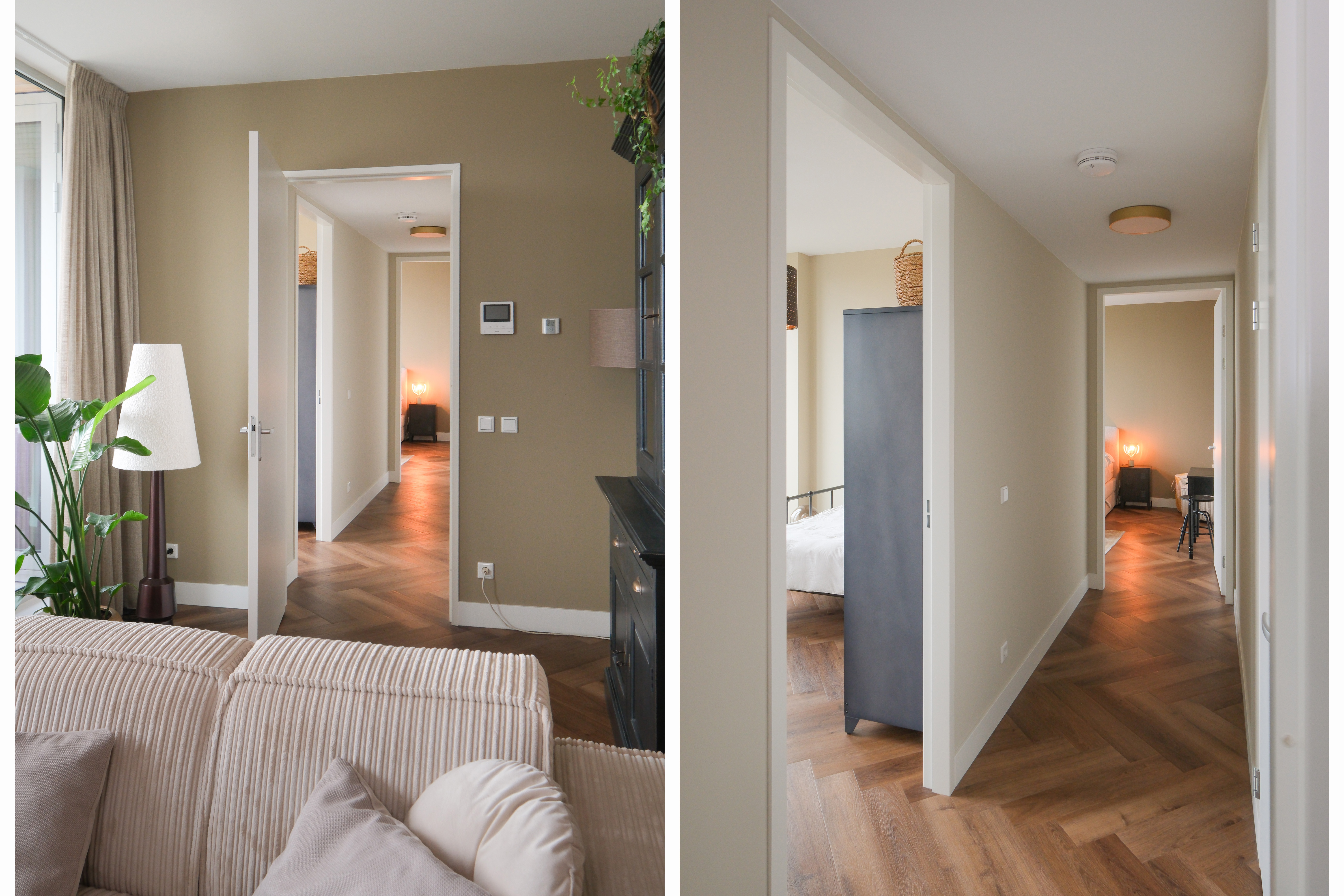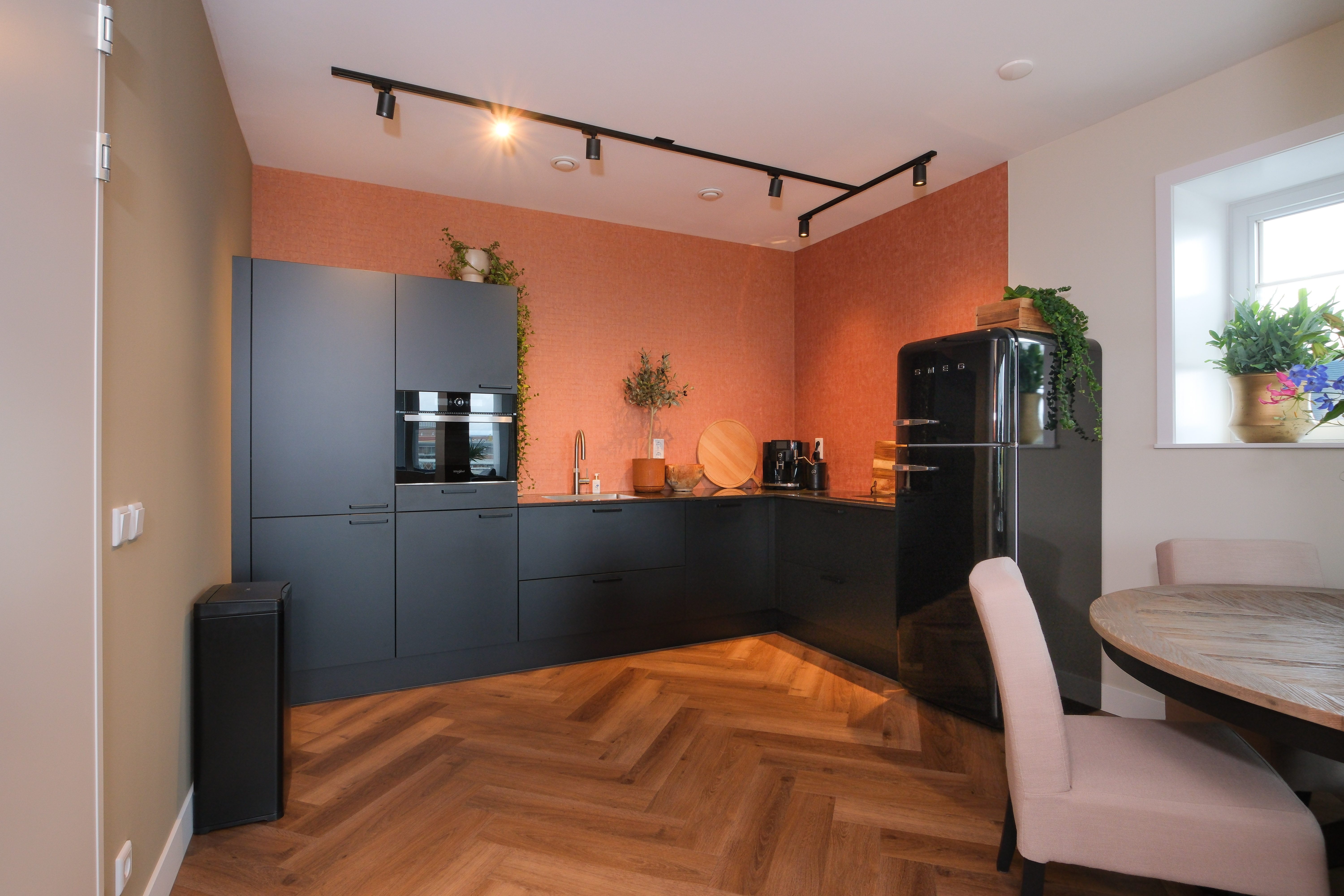 Het interieur is warm en eigentijds: een visgraatvloer, natuurlijke materialen en zachte tinten creëren samen een harmonieuze sfeer. De open keuken is stijlvol en strak, compleet met hoogwaardige inbouwapparatuur. De living ademt rust en nodigt uit om de dag even los te laten.