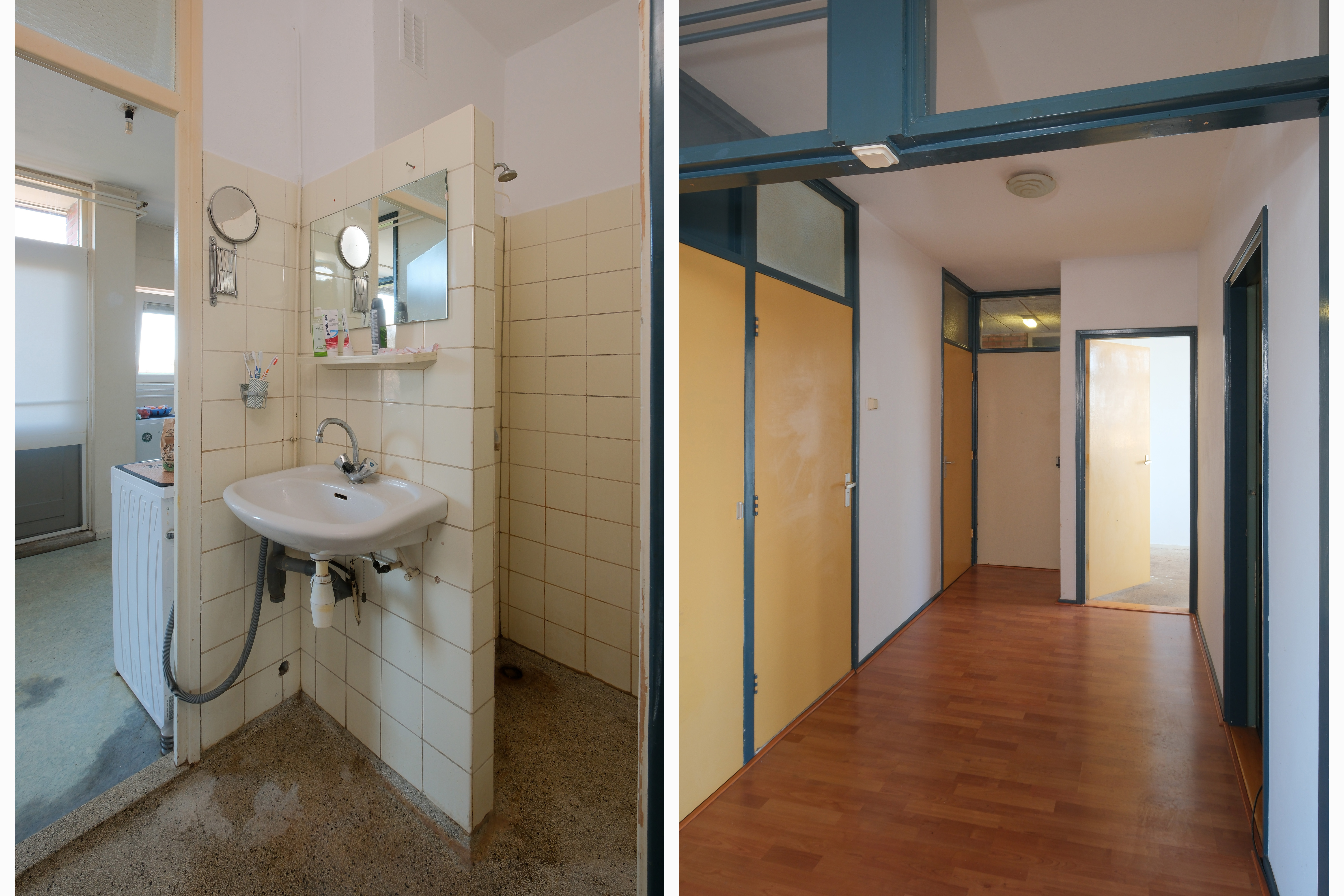 De badkamer is ook bereikbaar vanuit de keuken en nog in originele staat, voorzien van een douche en wastafel.