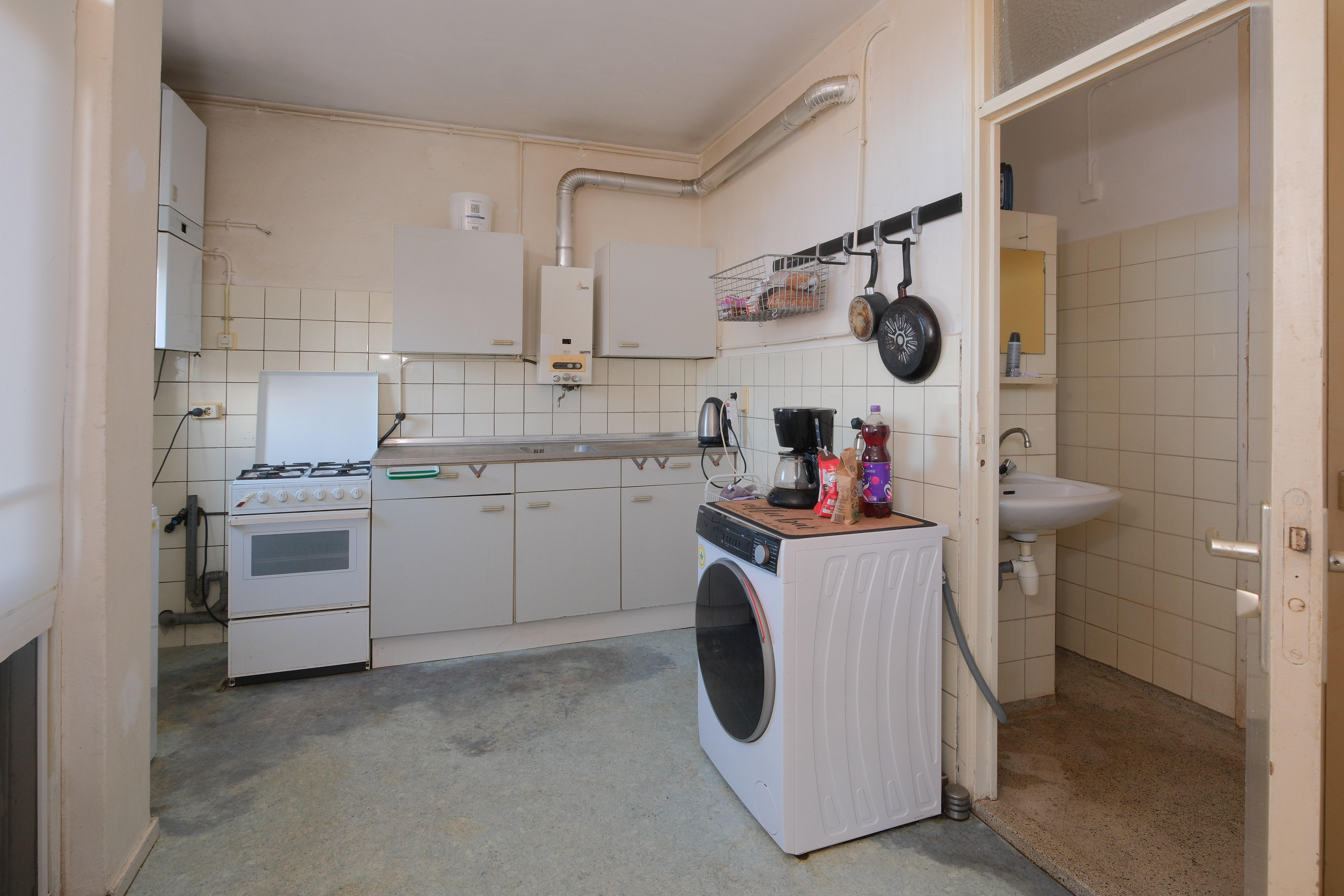De gesloten keuken is royaal van formaat, beschikt over een eenvoudig keukenblok, een vaste kast en de wasmachineaansluiting.