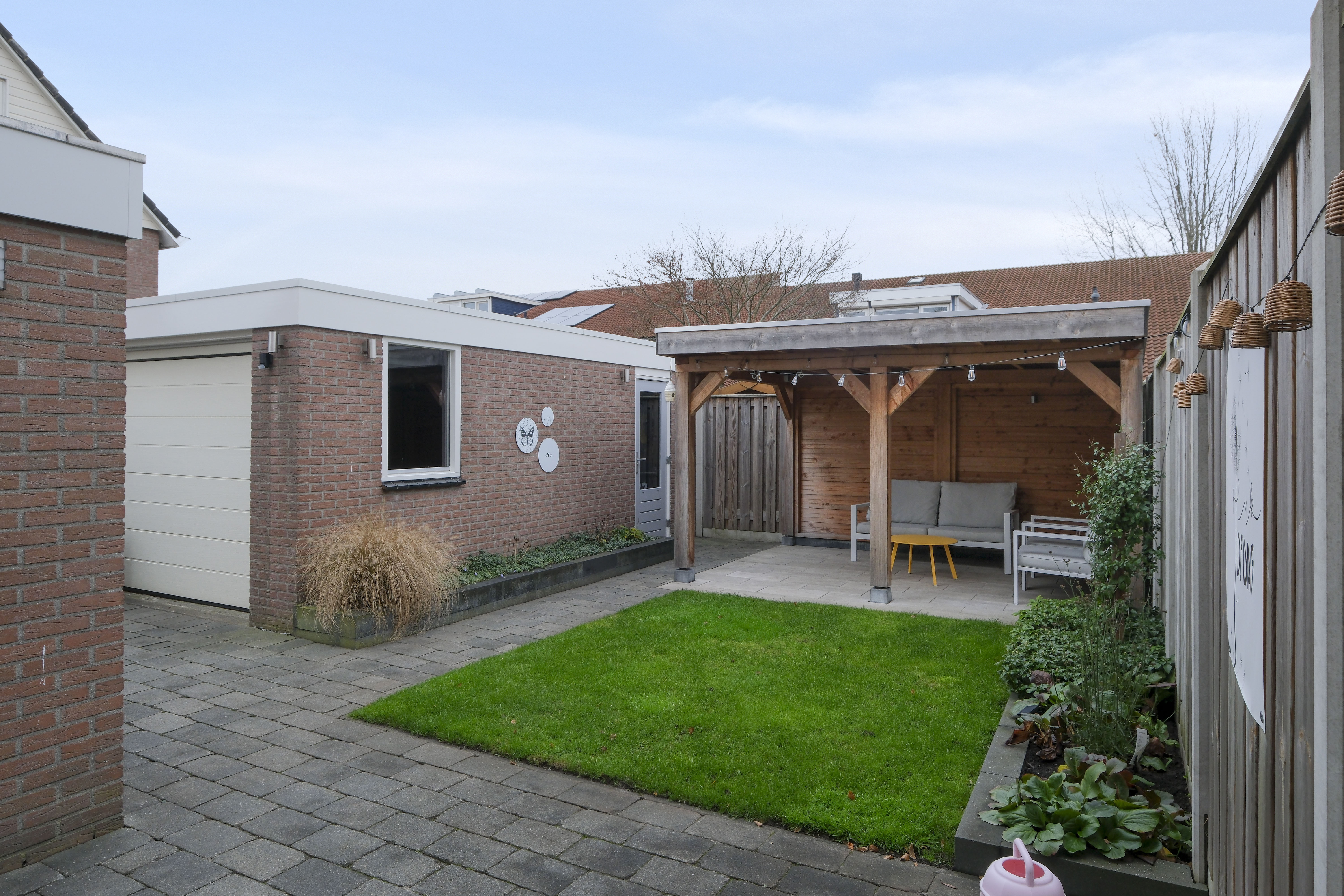 Via de openslaande deuren (vernieuwd in 2023) of het achterportaal loop je de achtertuin in. Een tuin die perfect is aangelegd, heerlijk groen én voorzien van een fantastische overkapping uit 2020. Vanuit de tuin bereik je ook de vrijstaande garage (ca. 6 m x 3,38 m). Super praktisch.