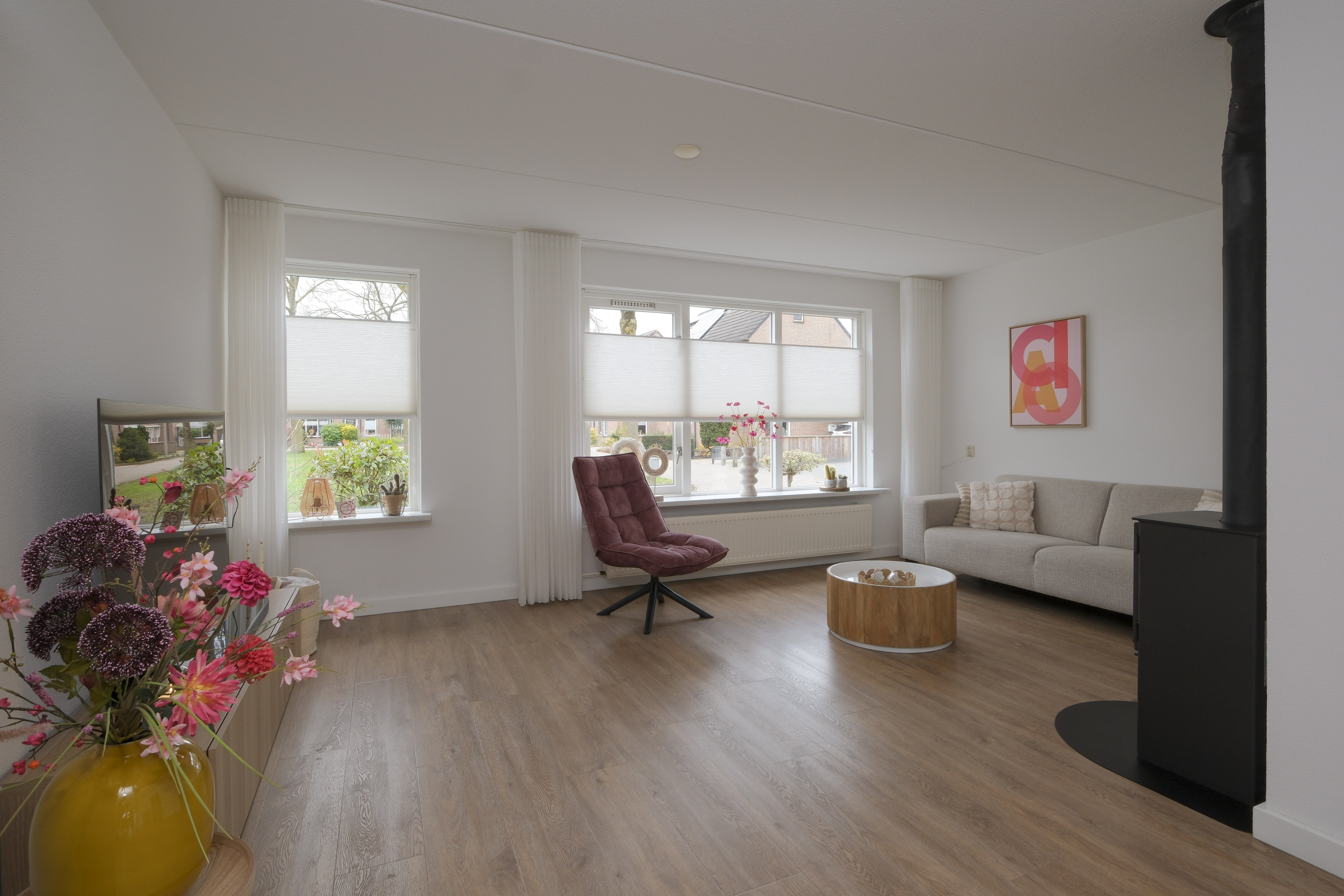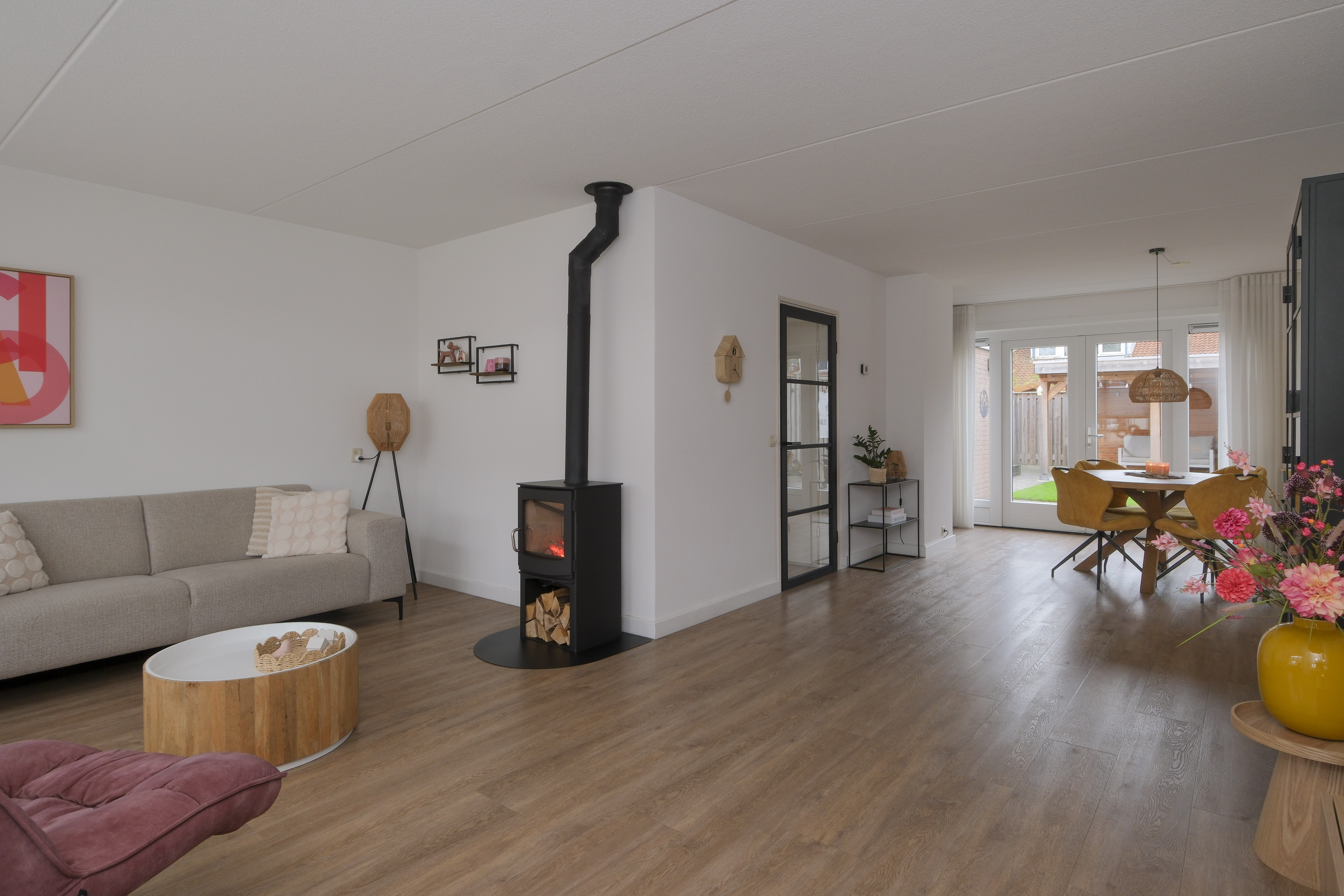 De moderne tussendeur brengt je naar de living. Het is zo’n woonkamer waar je moeiteloos neerploft en de drukte van de dag van je afglijdt. Lichte wanden, een moderne PVC-vloer, een gezellige houtkachel