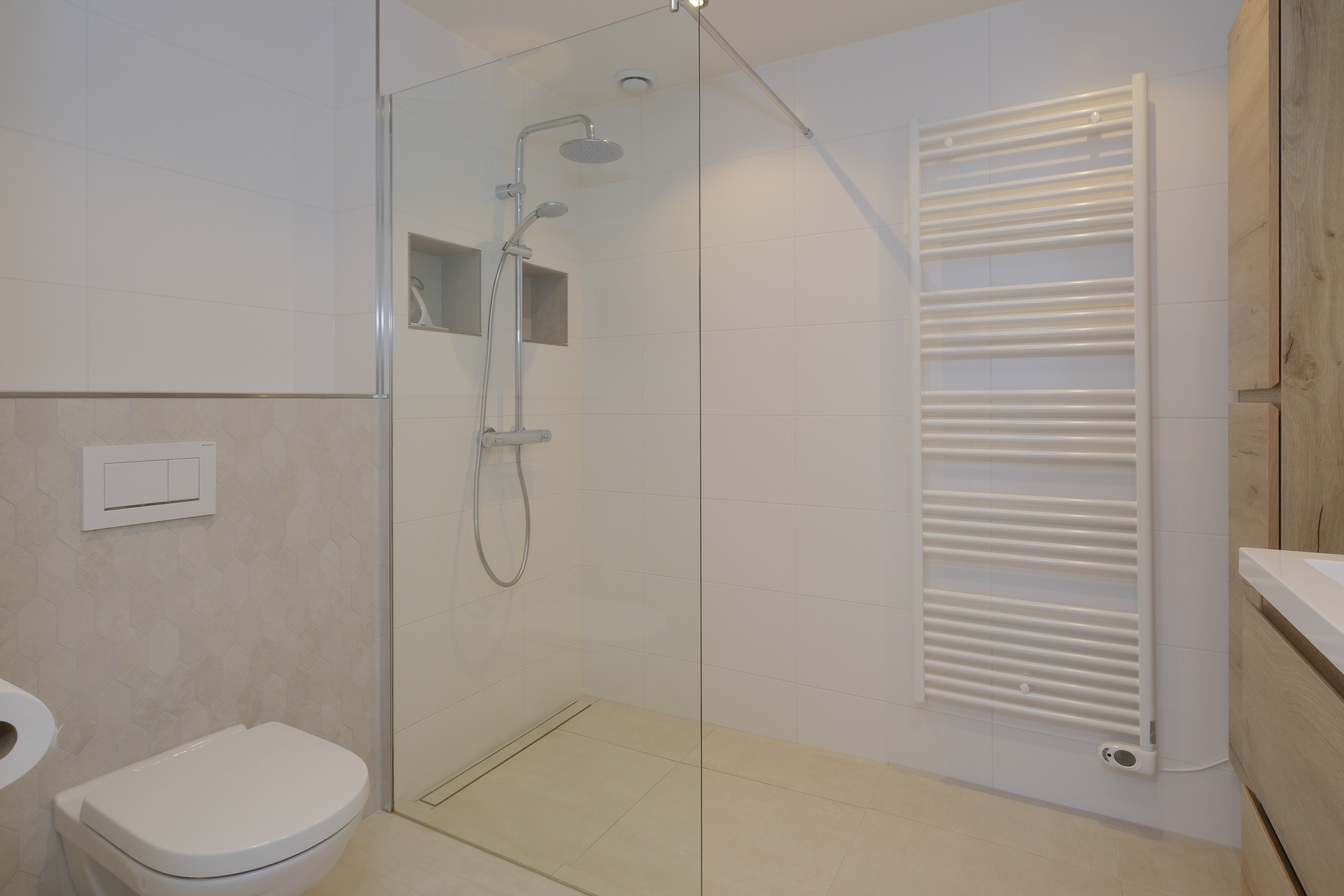 De moderne badkamer is vernieuwd in 2023 en heeft echt dat wellnessgevoel. Alles stijlvol. Alles nieuw.