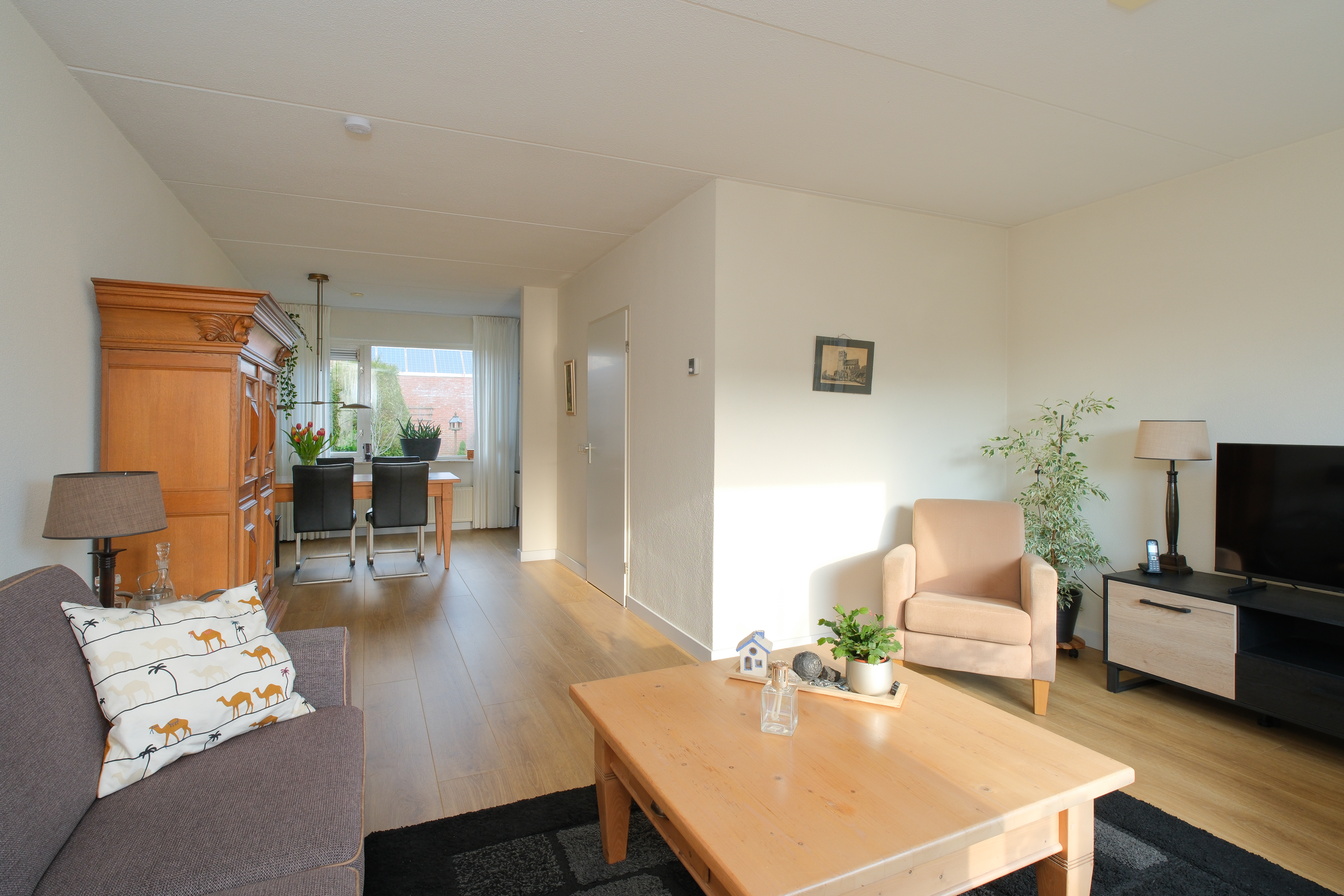 De woonkamer aan de voorzijde en de moderne halfopen keuken aan de achterzijde vormen samen een prettige leefruimte waar gezelligheid en ontspanning moeiteloos samengaan. Vanuit de keuken loop je zo de achtertuin in. Een fijne, groene plek met borders en beplanting, waar je ondanks de noord ligging maar dankzij de royale afmetingen altijd een zonnig plekje vindt om even te relaxen.