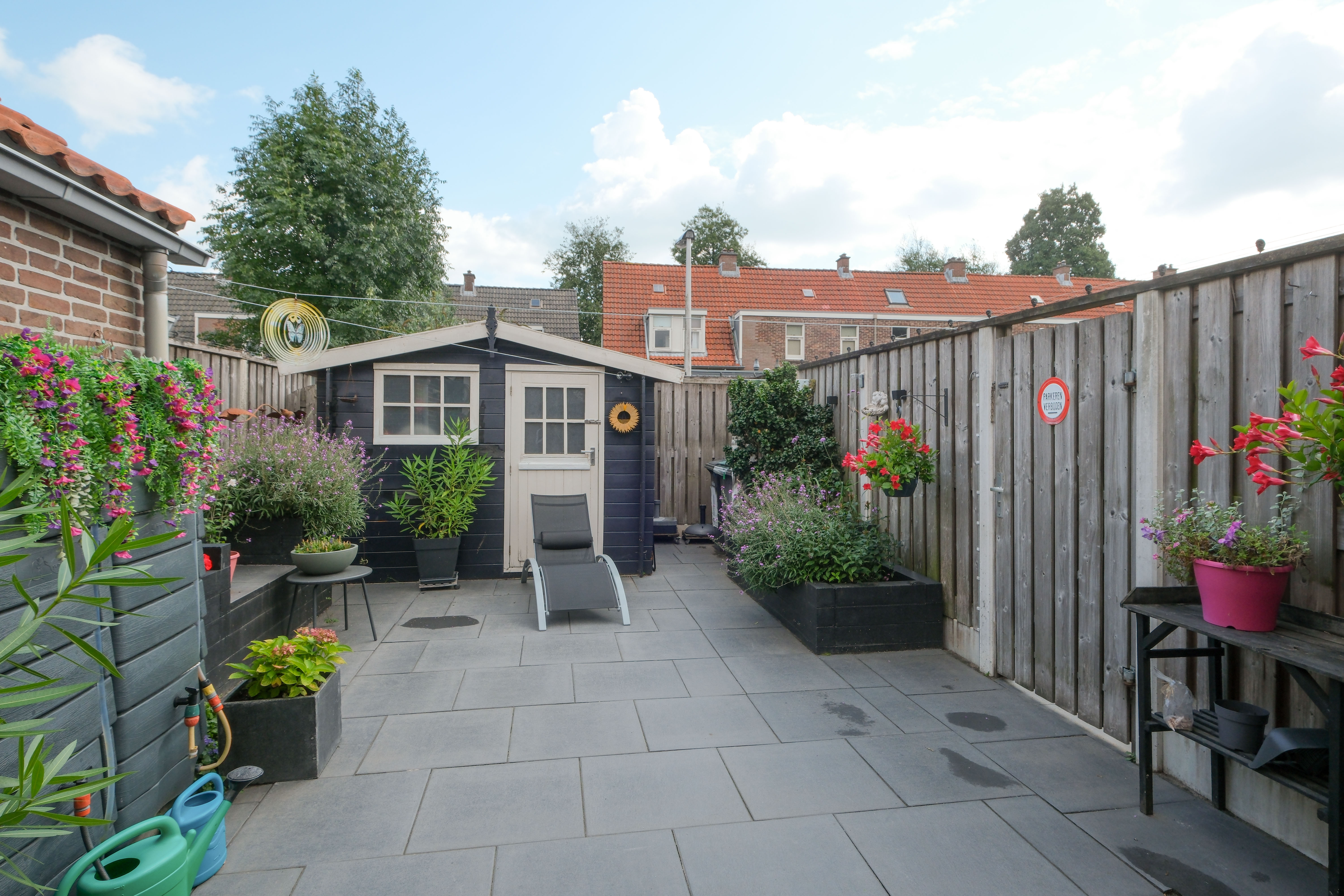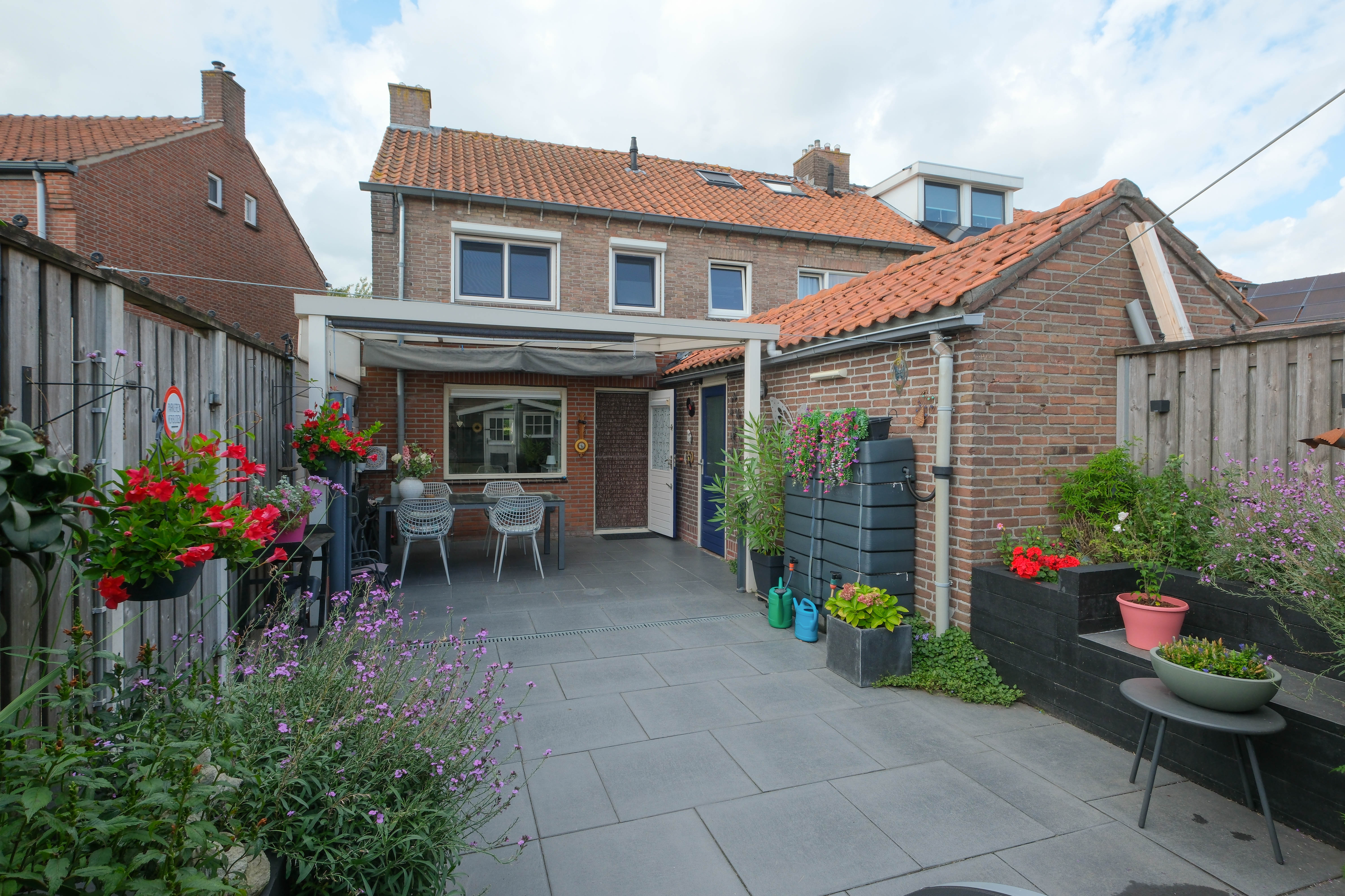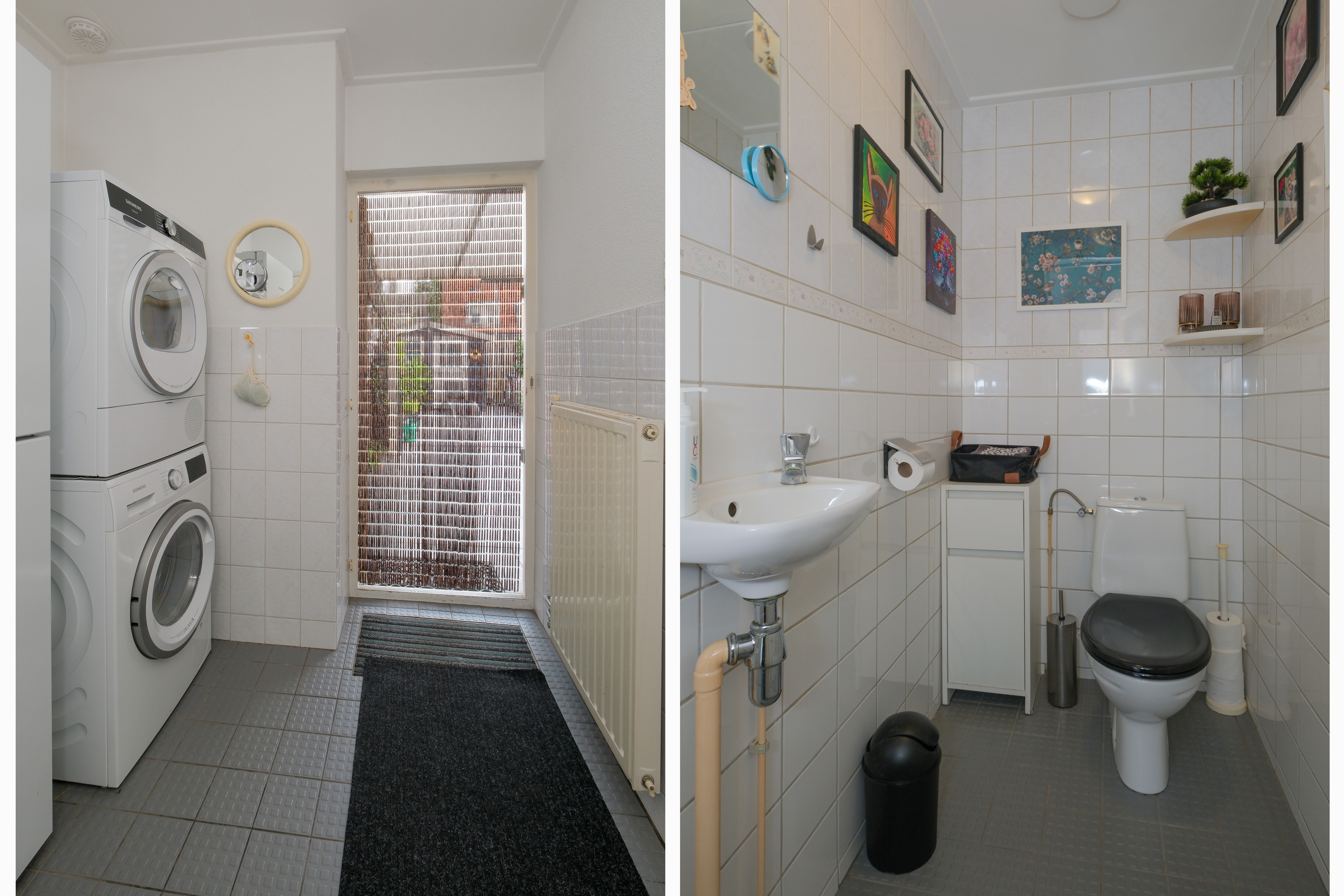 Achter de keuken ligt het achterportaal met o.a. witgoedaansluitingen en een verrassend ruime toiletruimte. Vanuit hier stap je de tuin in..en wat voor één. Onderhoudsvriendelijk met sierbestrating en toch groen door de borders. Een mooie stenen berging, houten tuinhuis én ‘achterom’ via de poort naast het huis maken het plaatje compleet. De ligging op het zuidoosten zorgt voor een zonnig begin van de dag, terwijl je onder de overkapping de avond zacht afsluit.