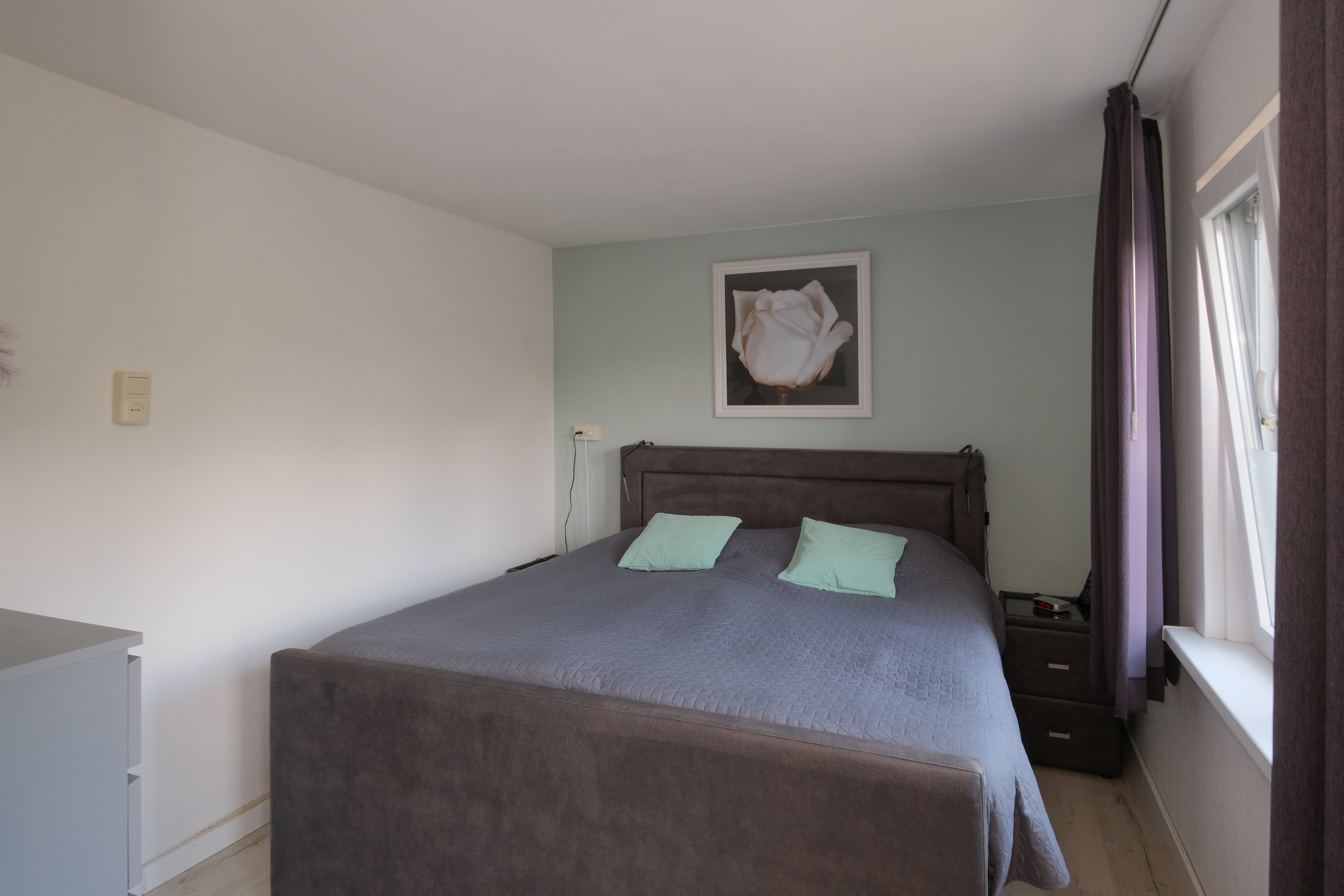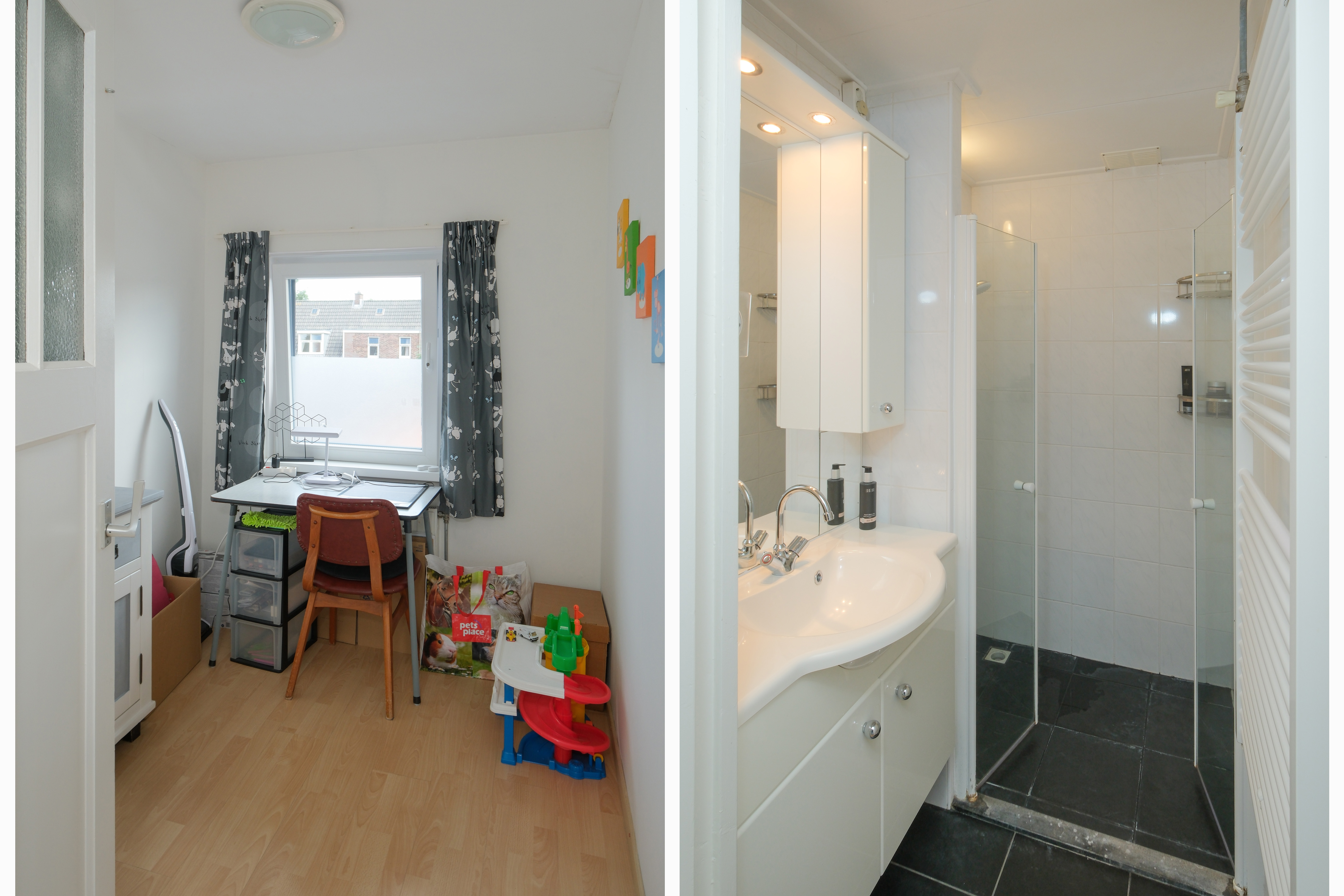 De eerste verdieping telt drie keurige slaapkamers, allemaal met laminaatvloeren en kunststof kozijnen. Twee kamers zijn daarbij uitgerust met een inbouwkast. De badkamer is fris en praktisch, voorzien van een douchehoek en wastafelmeubel.