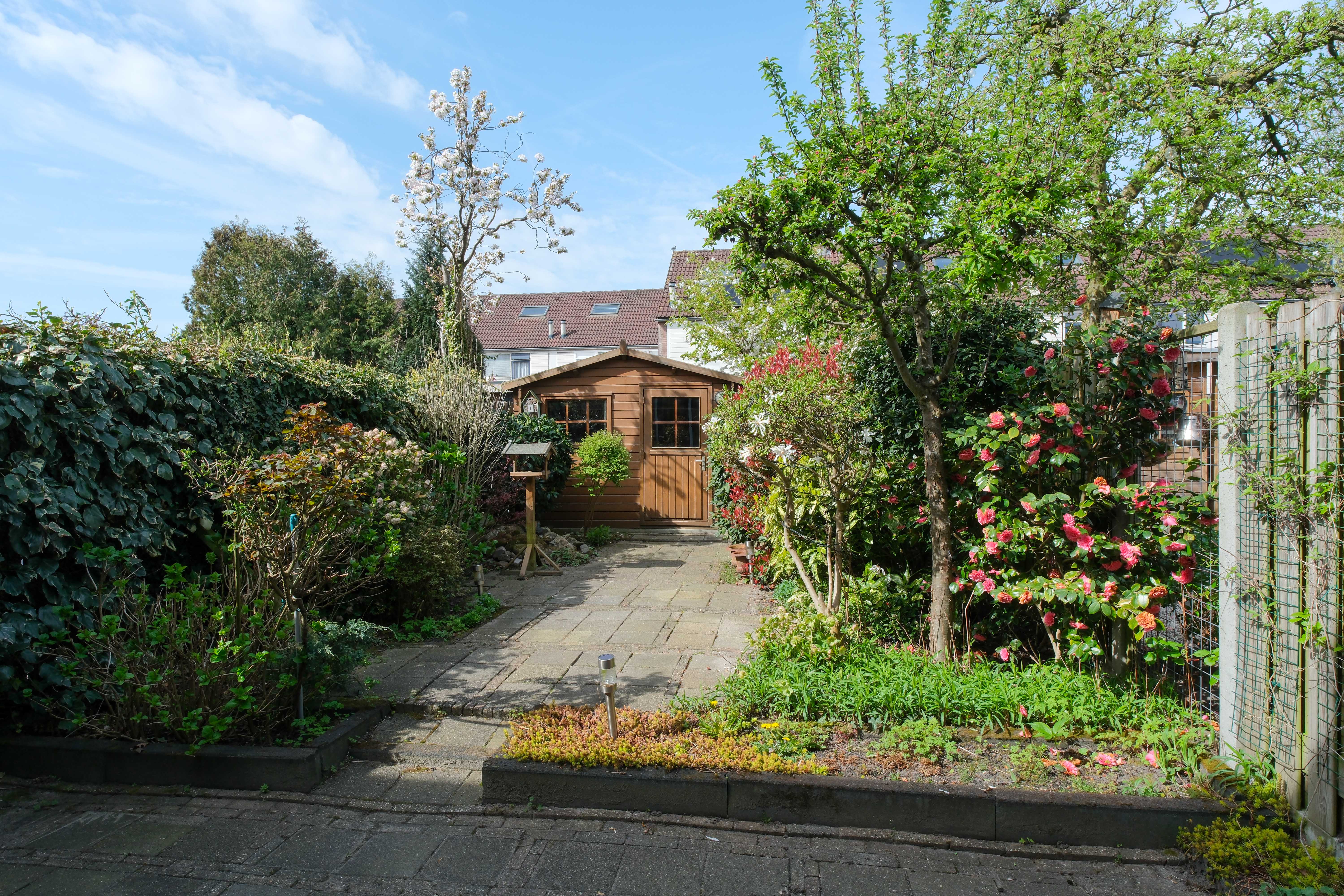 Vanuit de keuken loop je zo de achtertuin in. En die verrast! Groen, verzorgd en met voldoende privacy. Een ruim terras en een houten tuinchalet maken dit tot een plek waar je graag zit. Via de afgesloten poort achterom is de tuin ook bereikbaar.