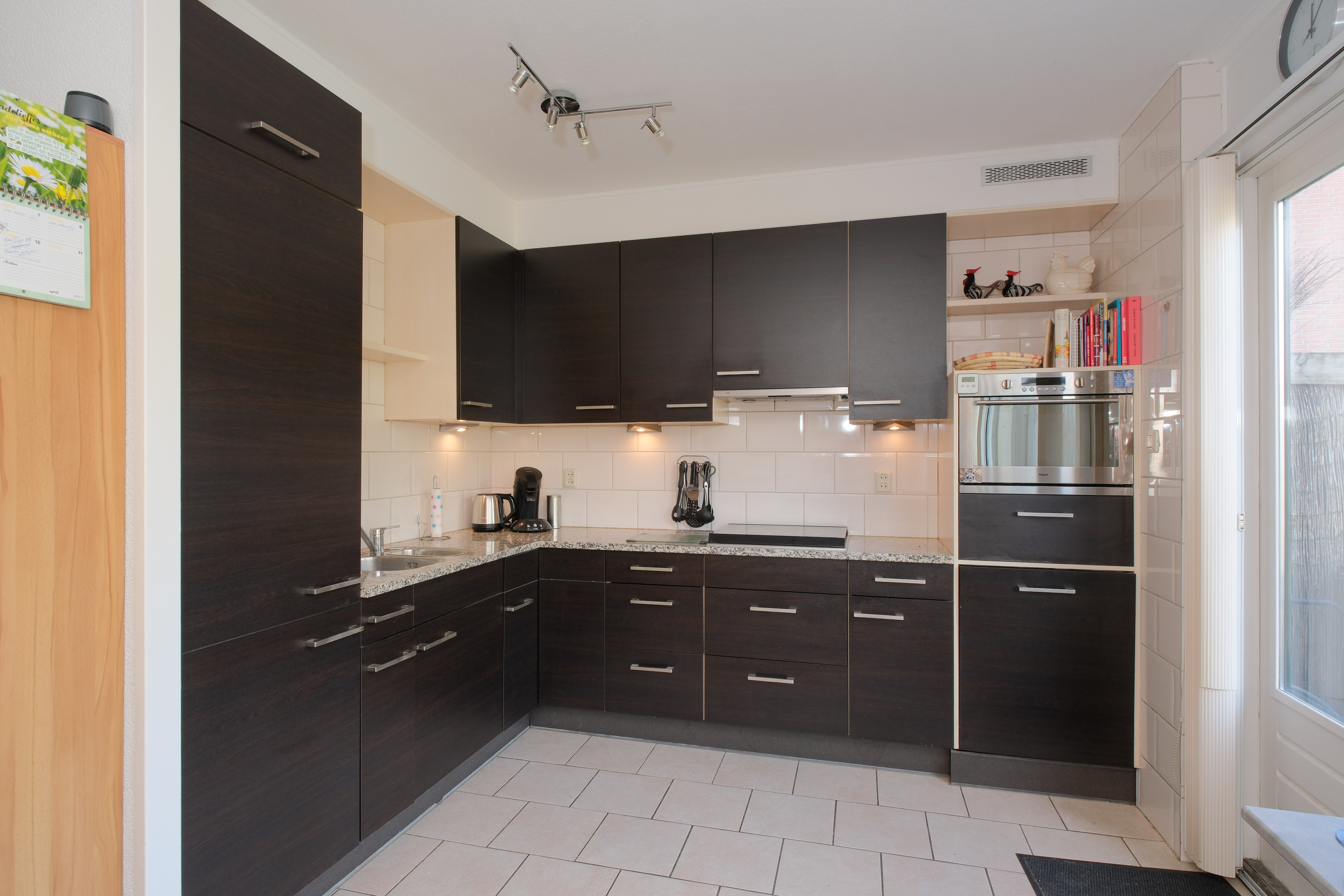 De woonkamer is licht en ruim, met aan de voorzijde een fijne zithoek en aan de achterzijde plek voor een eettafel. De half open keuken sluit hier mooi op aan en is uitgevoerd in een hoekopstelling met donkere fronten en diverse inbouwapparatuur.