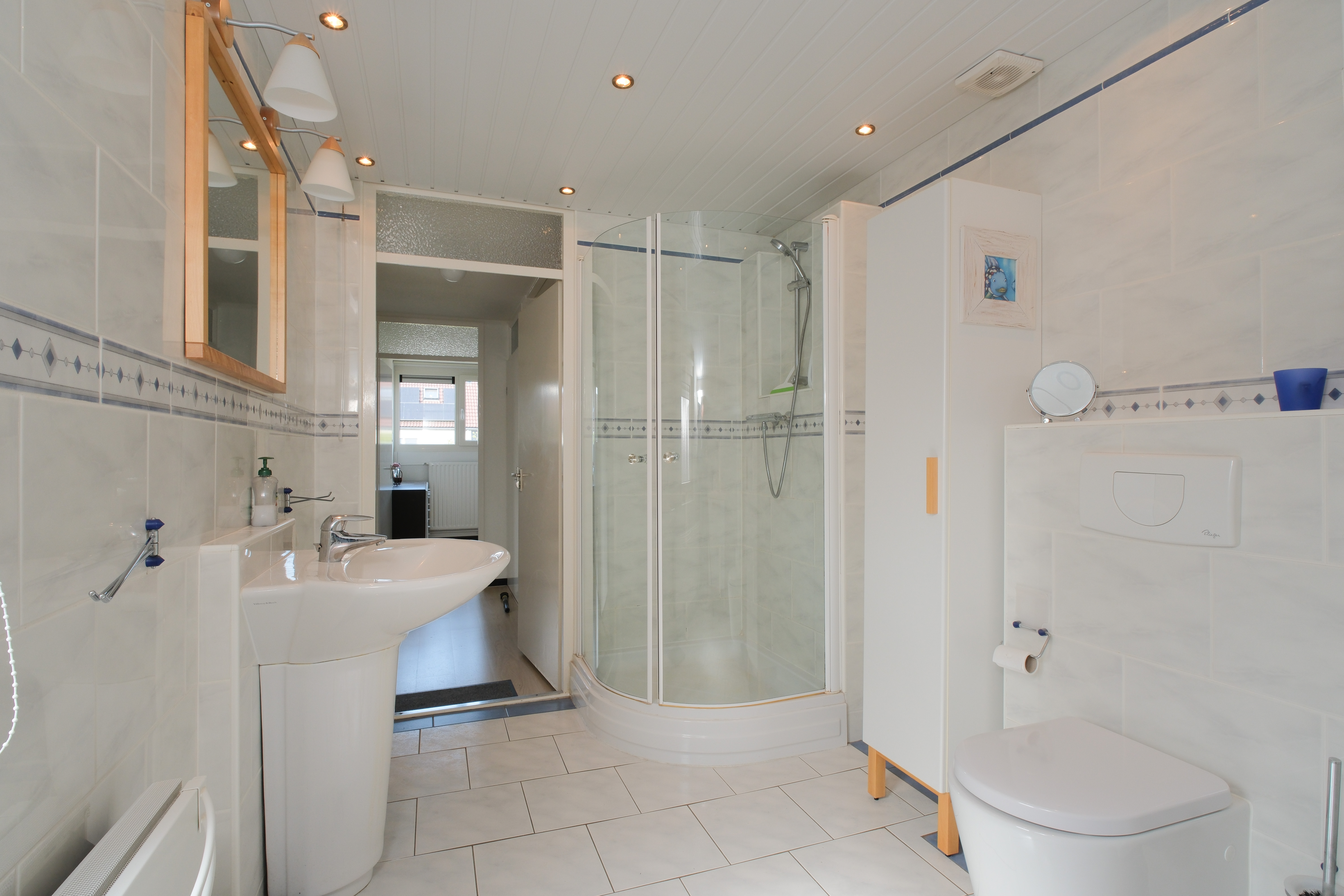 1e verdieping: op de eerste verdieping tref je via een royale overloop drie slaapkamers van goed formaat. De hoofdslaapkamer ligt aan de achterzijde. Alle kamers zijn voorzien van moderne laminaatvloeren. De badkamer is vergroot en voorzien van een douche, wastafel en tweede toilet.