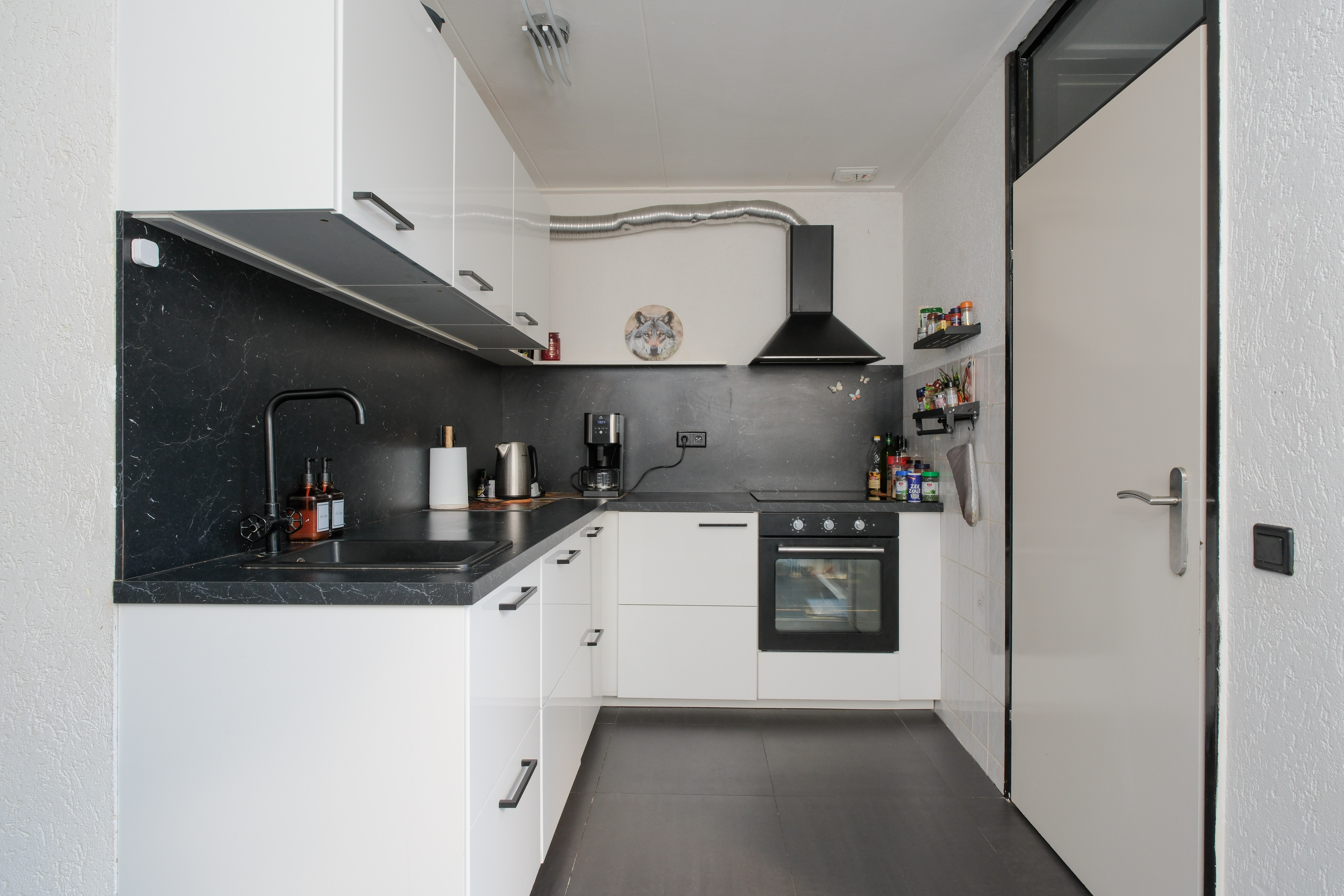 De half open keuken uit 2021 (met een inductiekookplaat, afzuigkap, oven en vaatwasser) sluit hier naadloos op aan. Samen vormen ze een fijne leefruimte waar je zowel kunt relaxen als vrienden ontvangt.