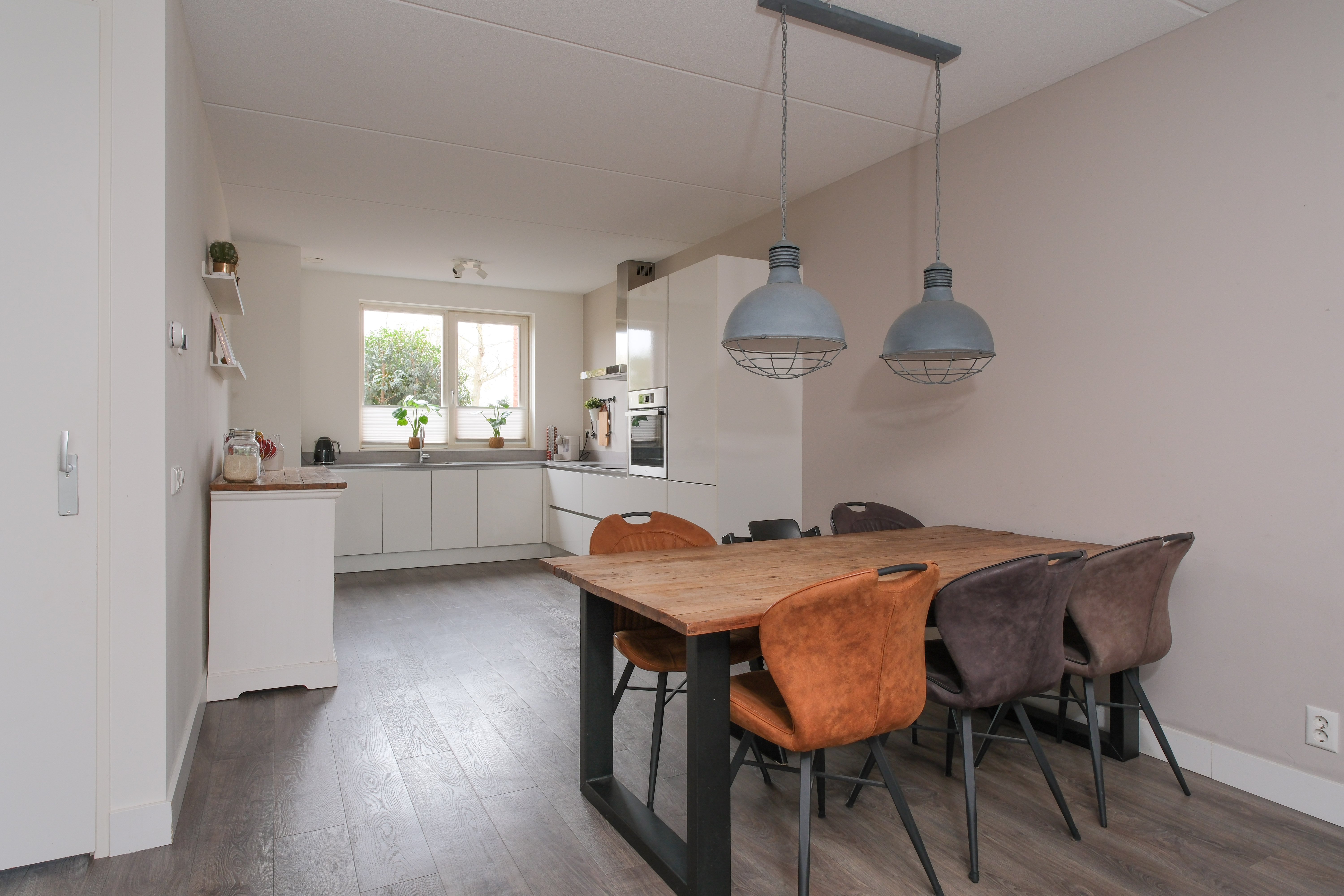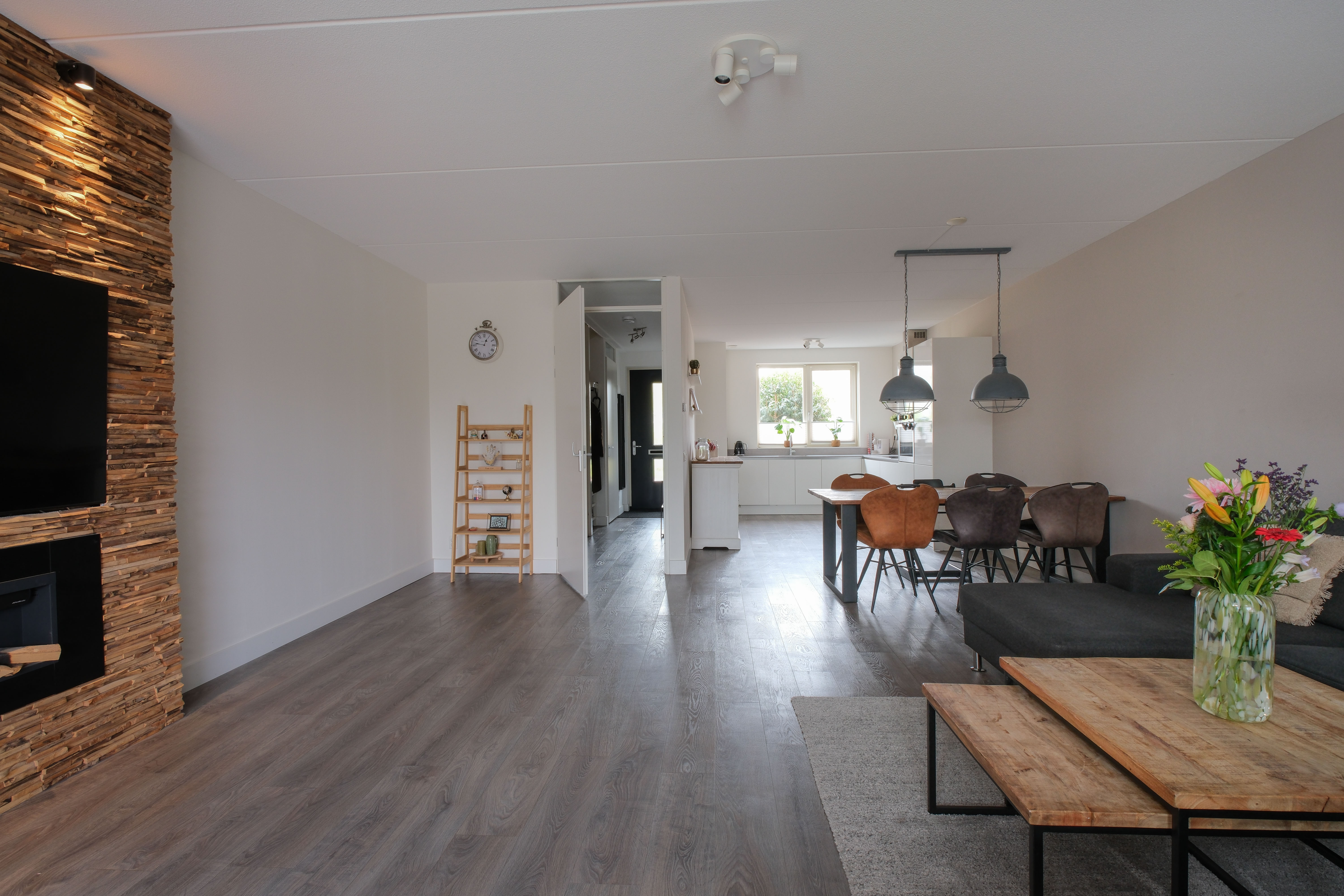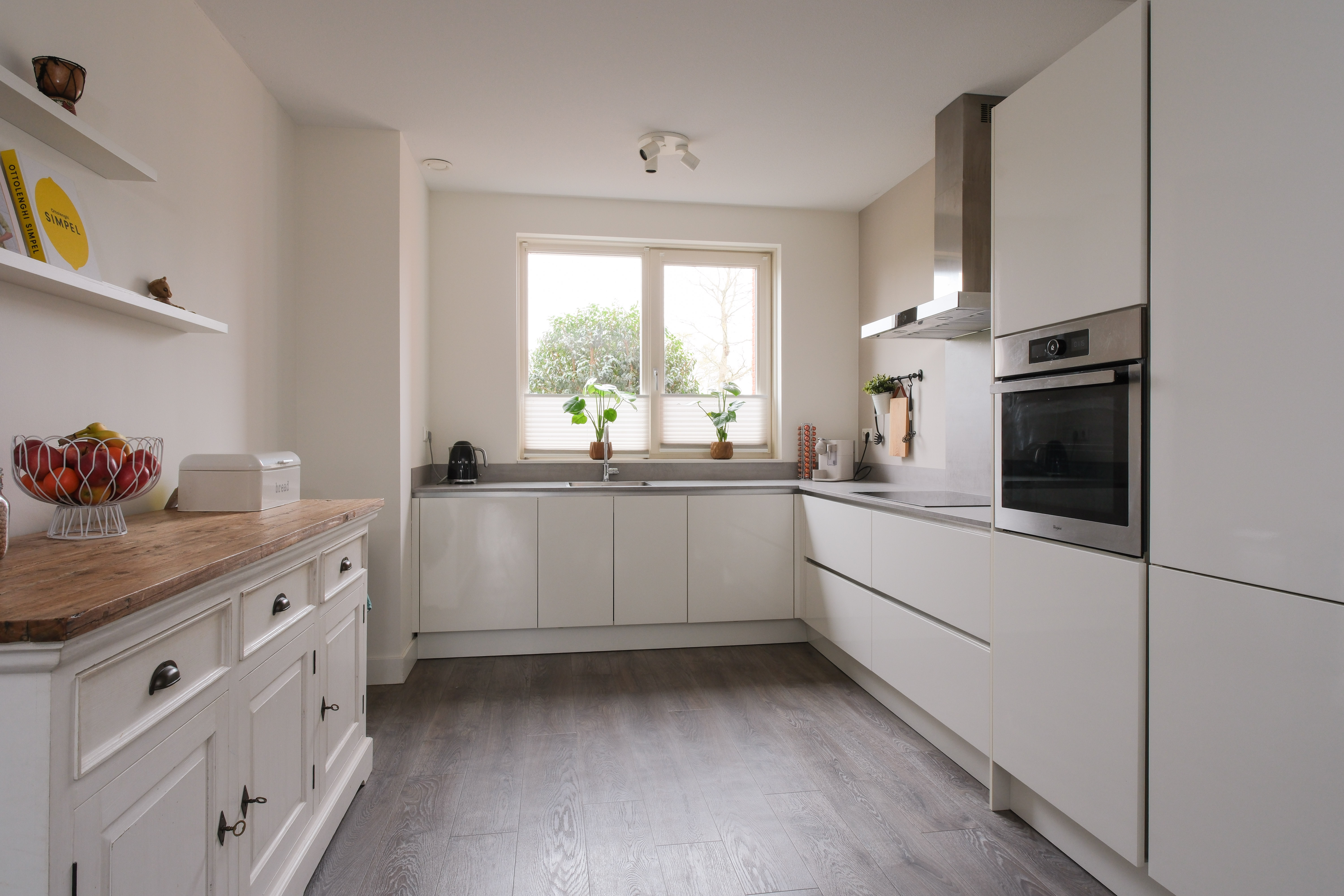 Lopen we rechtdoor stappen we soepel de living binnen die geheel voorzien is van vloerverwarming. Aan de voorzijde vind je de keuken. Fris, smaakvol en praktisch opgesteld in een hoekopstelling en uitgerust met een vaatwasser, inductiekookplaat, RVS afzuigkap, oven en de koel-vriescombinatie. De woonkamer is tijdens de bouw al verlengd. Hier heb je alle ruimte voor een grote eettafel én een comfortabele zithoek.