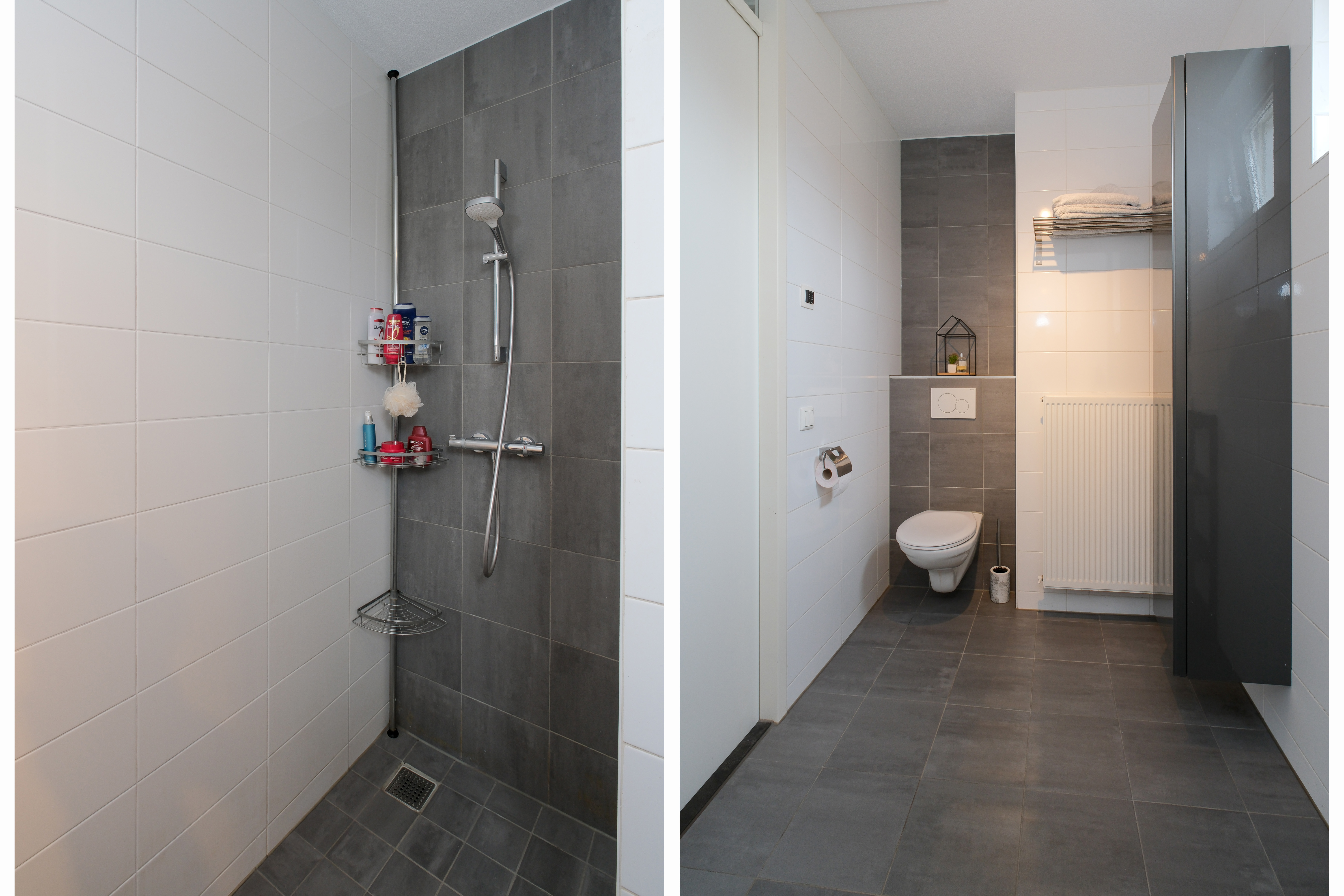 De badkamer is verzorgd en praktisch ingericht met een douchehoek, wastafel en tweede vrijhangend toilet.