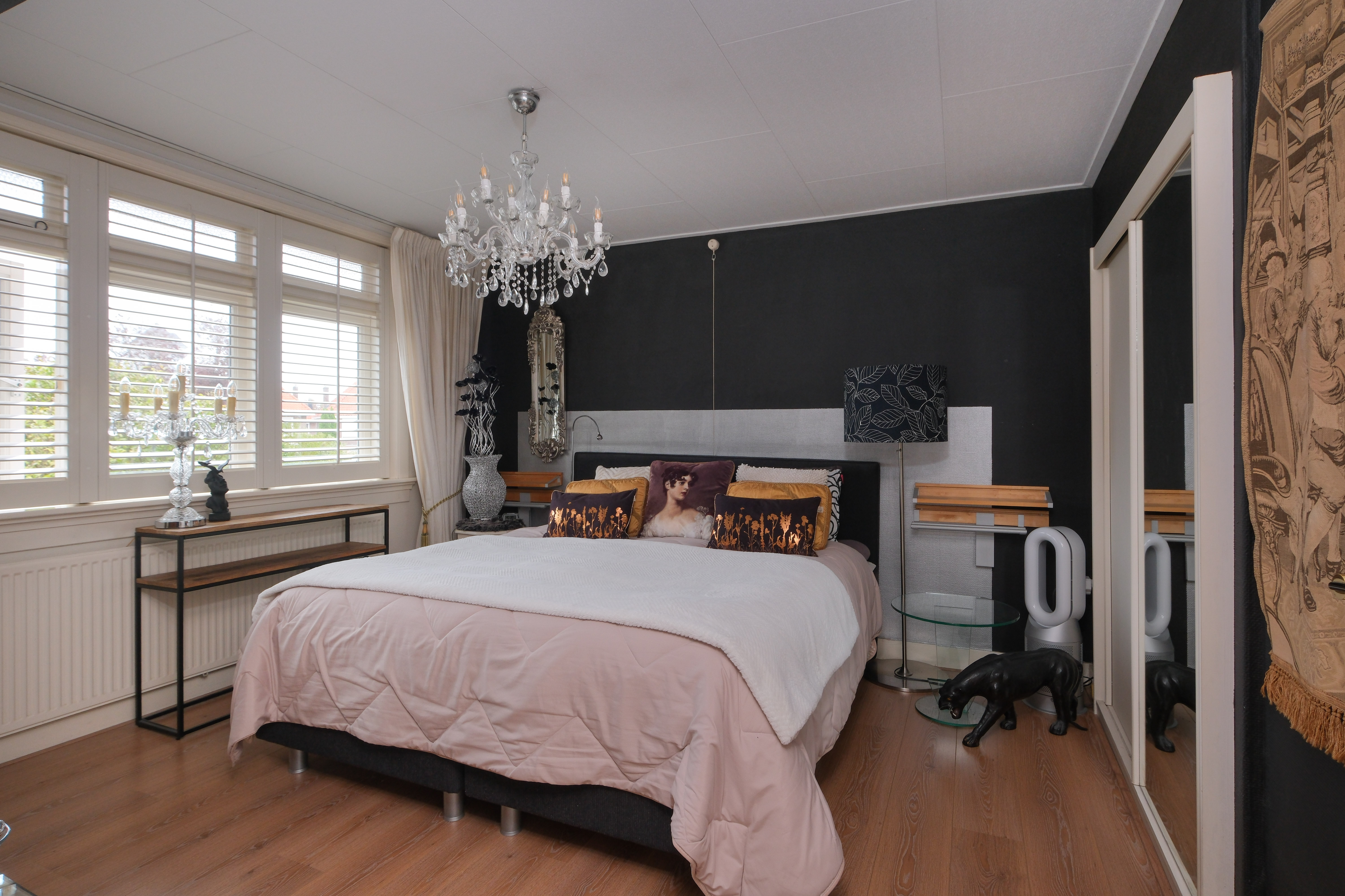 De klassieke jaren ’30-kenmerken zijn bewaard gebleven, maar nergens oubollig. Denk aan hoge plafonds, originele trappen, glas-in-lood, een erker met daarboven een sfeervol balkon, een grote dakkapel aan de voorzijde, een kamer en suite, – stuk voor stuk elementen die het huis zijn gezicht geven. De combinatie van authentiek met een slimme, ingetogen modernisering maakt dat alles precies in balans is. Niet over de top, maar doordacht en warm.