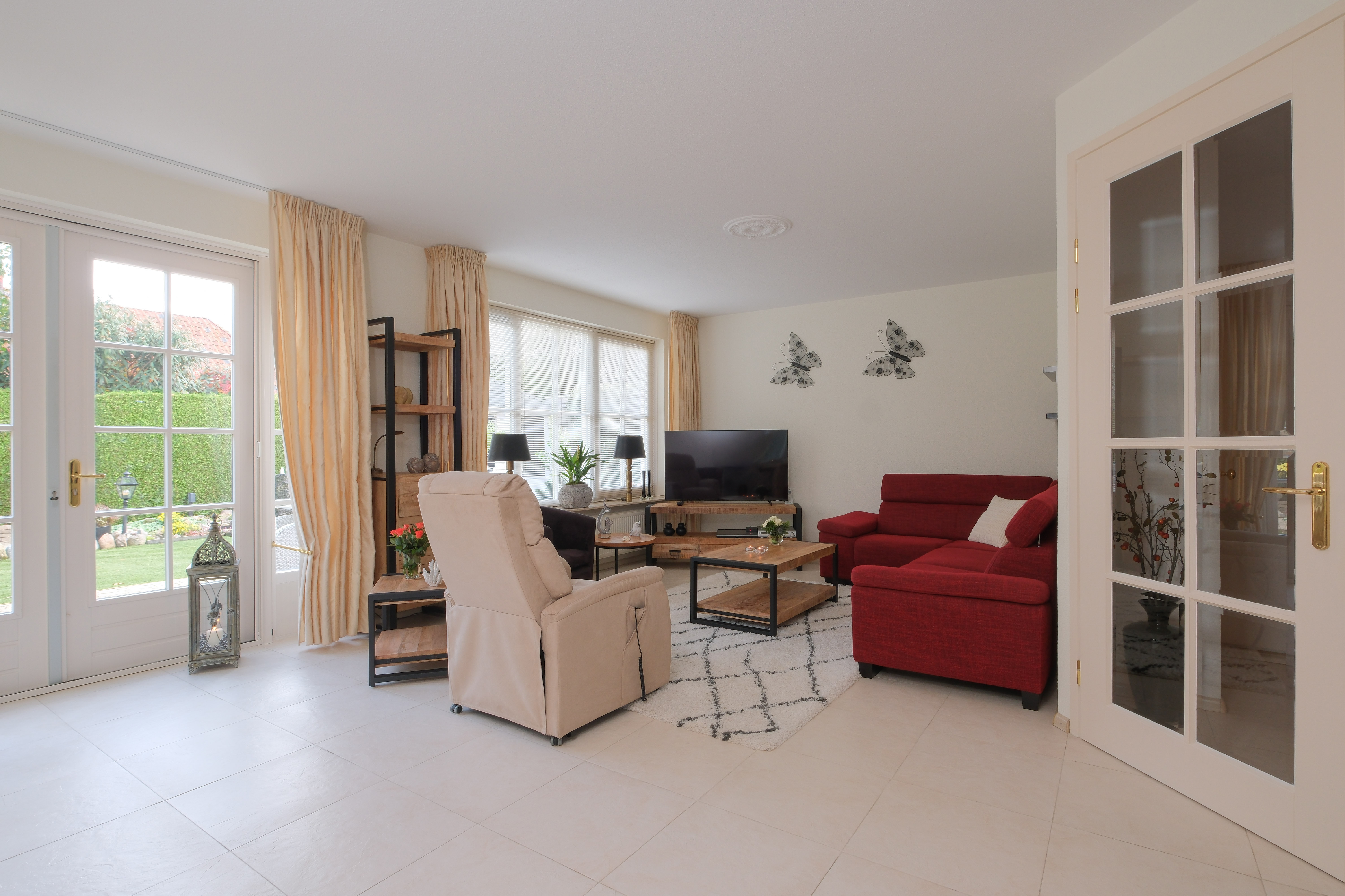 De openslaande tuindeuren in de achtergevel halen buiten naar binnen, terwijl de grote ramen (met mooie roedeverdeling) zorgen voor een zee van daglicht. De lichte plavuizen vloer met vloerverwarming voelt behaaglijk aan, de elektrische haard brengt nog meer sfeer – dit is zo’n plek waar je écht thuis bent en optimaal kunt ontspannen na een drukke dag.