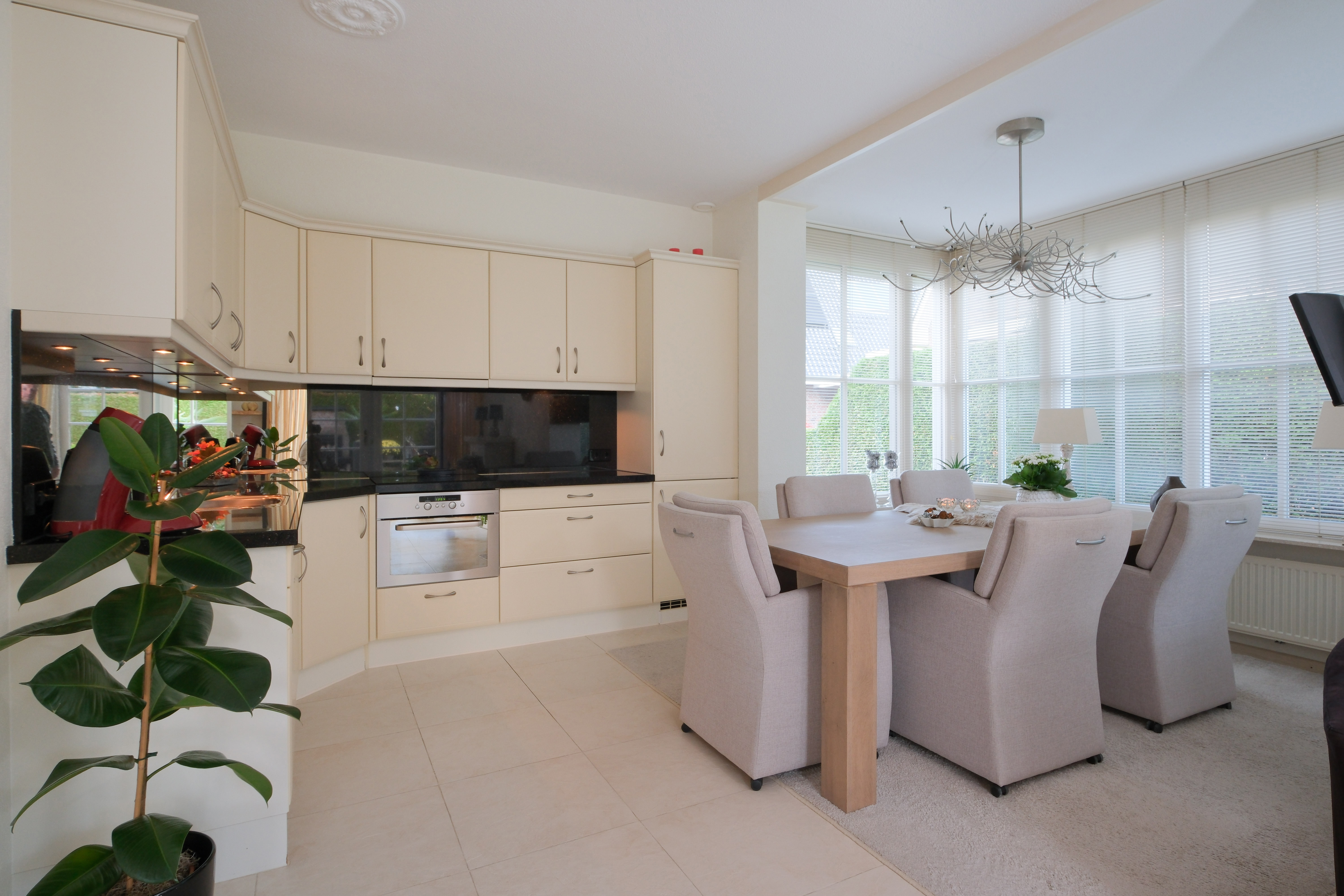 De open keuken met erker (geplaatst in 2013) is zo’n plek waar koken, eten en het dagelijkse leven subtiel samenkomen. Ruimte voor een royale eettafel met uitzicht over de zijtuin, perfect voor een heerlijk ontbijt, gezellige diners of gewoon een goed glas wijn in fijn gezelschap. Alles voelt binnen verzorgd en prettig aan.