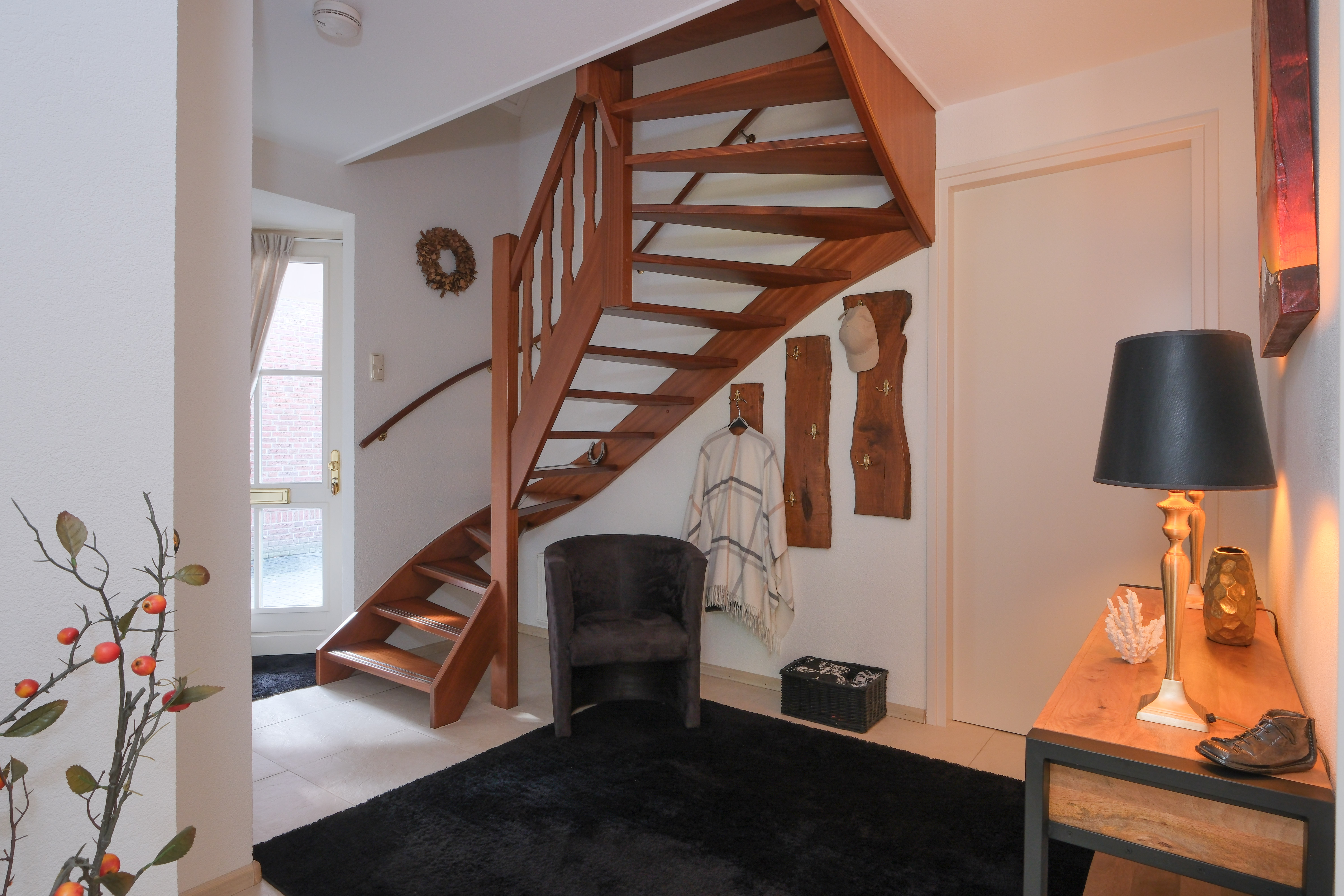 Binnen stap je een sfeervolle ontvangsthal in. Hier vind je o.a. de meterkast, toiletruimte voorzien van keurig hangcloset + fonteintje en de trapopgang naar de 1e etage.