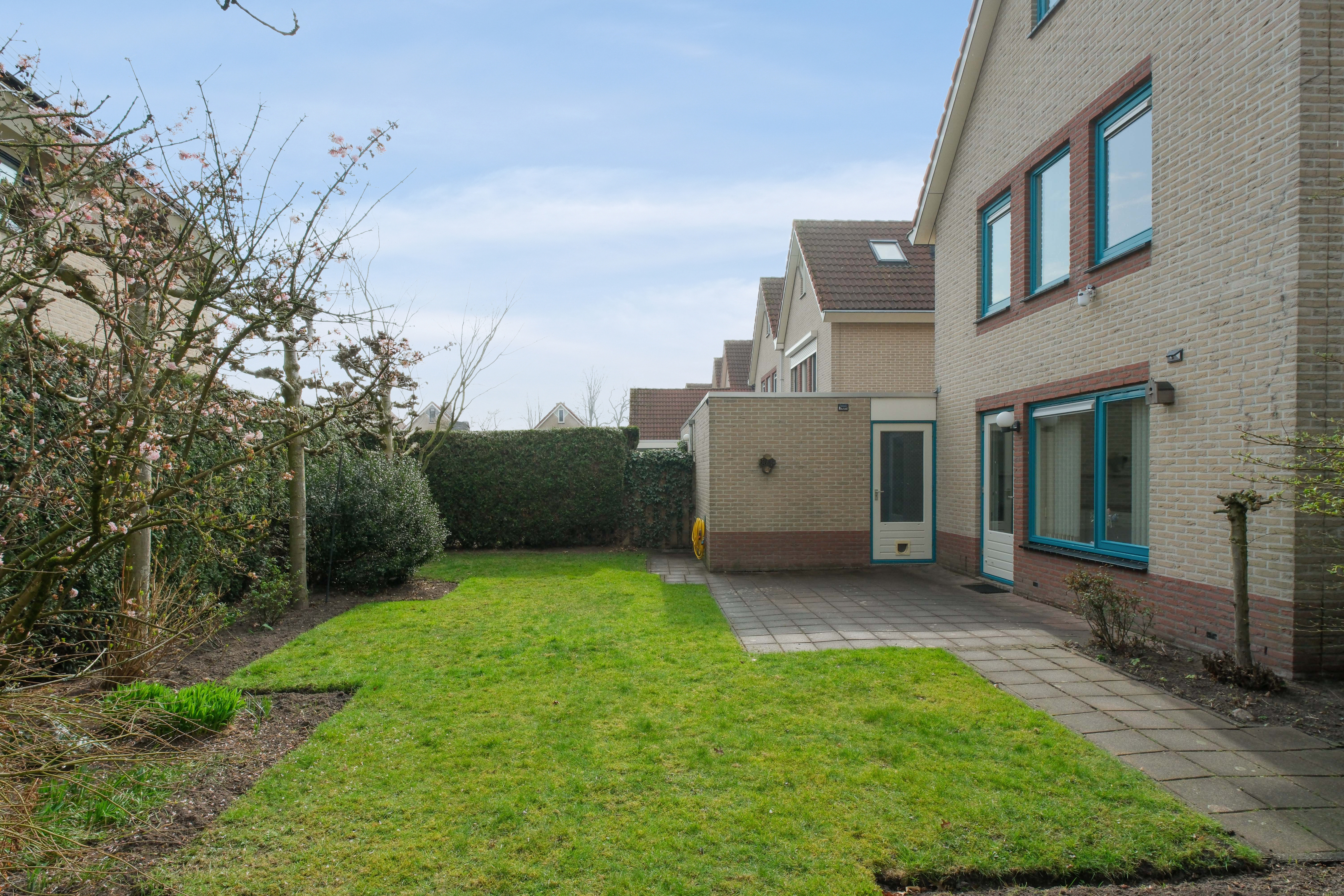 De achtertuin ligt op het oosten en is keurig aangelegd met gazon en kleurrijke borders. Hier begin je de dag in de ochtendzon en vind je altijd een fijne plek om te ontspannen. Met volop privacy en een handige achterom.